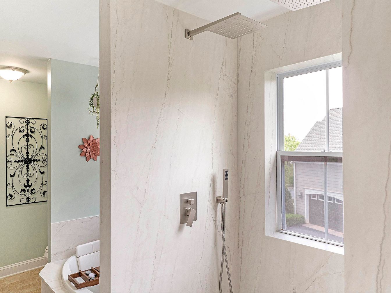 This bathroom shower area features soft, marble-like walls in light tones with subtle veining, creating an elegant and clean atmosphere. A sleek, square rain shower head and a handheld shower attachment in brushed nickel add modernity and functionality. Natural light filters in through a large window, brightening the space and offering a view outside. Adjacent to the shower, a corner bathtub with a wooden caddy hints at relaxation. Decorative wall art in soft muted colors and a hint of greenery seen beyond the shower add a warm and inviting aesthetic. The overall design balances contemporary finishes with cozy touches.