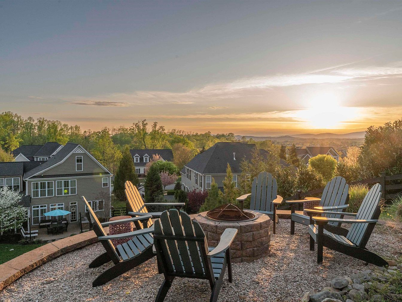 This serene backyard retreat features a circular stone firepit surrounded by six Adirondack chairs arranged on a bed of light-colored gravel, creating a cozy gathering spot. The seating area is elevated, offering expansive views of neighboring homes, lush greenery, and distant hills under a warm sunset sky. Natural earth tones dominate, with dark wood chairs contrasting against the neutral gravel and stone. The space blends rustic charm with functionality, making it an inviting place to enjoy evenings outdoors. The layout encourages social interaction while immersing guests in nature’s calming ambiance.