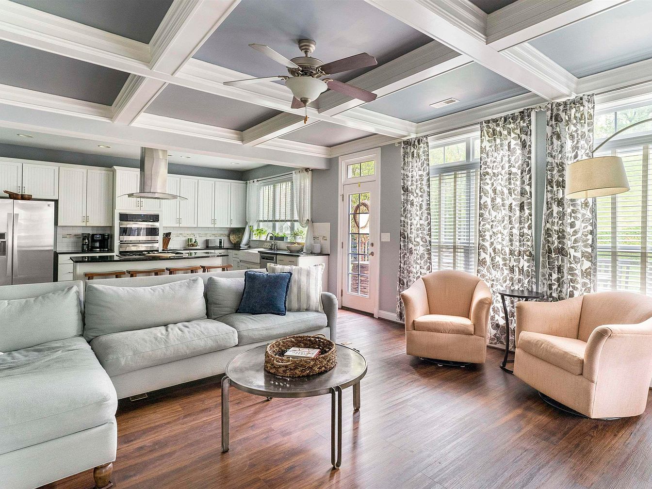 This open-concept living and kitchen space features a sophisticated, neutral palette with soft gray walls accented by white coffered ceilings that add architectural interest. The kitchen showcases sleek white cabinetry, stainless steel appliances, and a modern island with wooden stools offering a casual dining spot. In the living area, a large, pale gray sectional sofa is complemented by two blush-colored armchairs inviting relaxation. Floor-to-ceiling windows with patterned curtains provide ample daylight while a wooden floor unifies the space. The overall décor merges modern comfort with subtle elegance, creating a warm and airy atmosphere.