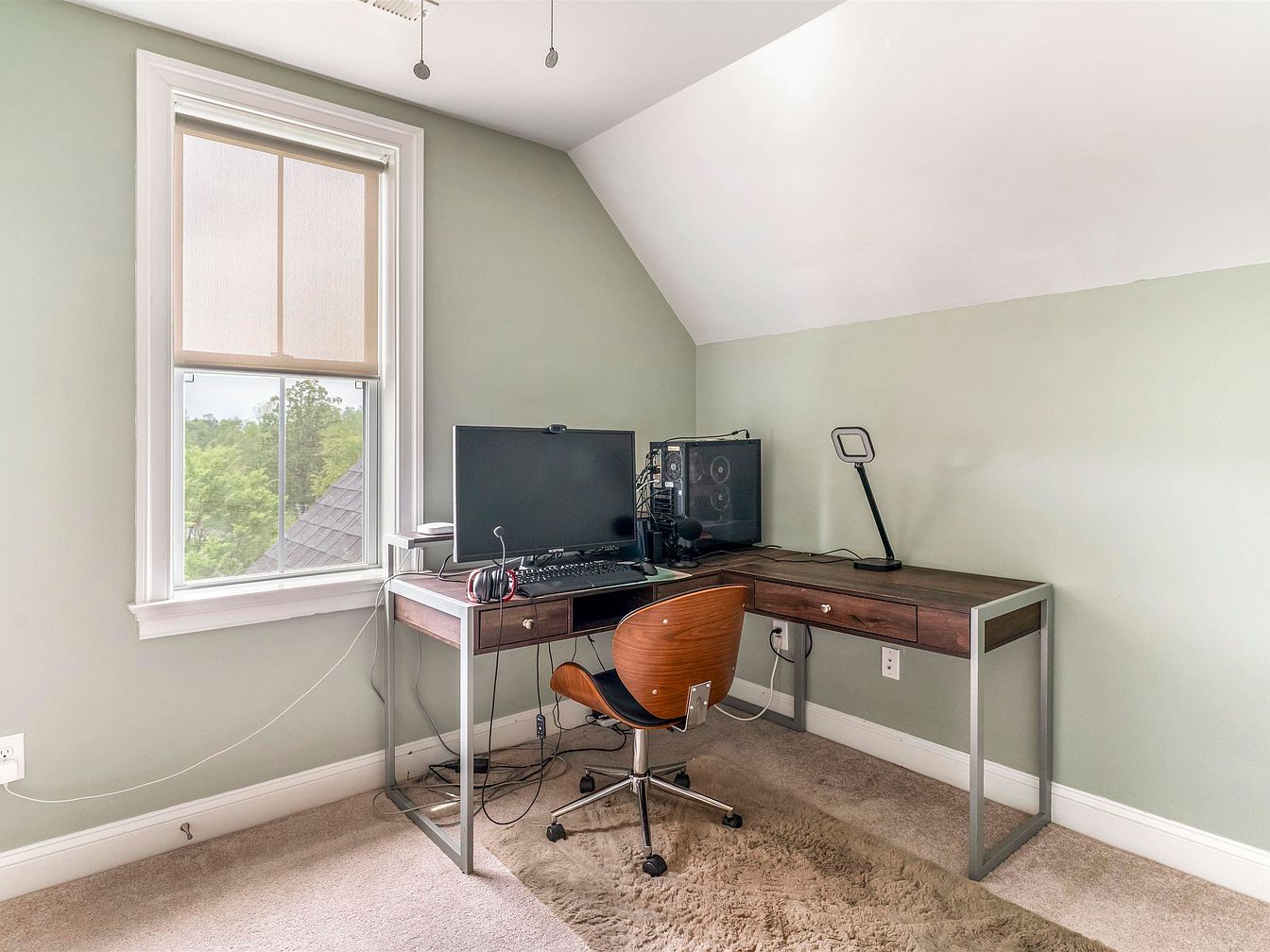 This cozy home office nook is situated by a tall window framed with classic white trim, allowing natural light to gently fill the space. The walls feature a calming muted sage green color, complementing the soft beige carpet beneath. An L-shaped desk with a dark wood surface and sleek metal legs maximizes the corner area, providing ample workspace. The desktop setup includes a monitor, keyboard, gaming headset, and a modern task lamp, alongside a high-end computer tower. A mid-century inspired swivel chair with a curved wooden back and black cushion adds a stylish yet functional seating option, enhancing the room’s minimalist and productive atmosphere.