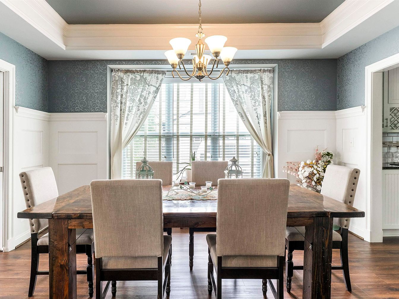 This dining space features a classic design with a harmonious blend of traditional and modern elements. A large wooden dining table with a rustic finish anchors the room, surrounded by six upholstered chairs in a neutral beige fabric that adds warmth and comfort. The walls showcase a two-tone design with white wainscoting on the lower half and subtle, patterned blue wallpaper above, topped with elegant crown molding. Natural light floods in through a wide window dressed with sheer floral curtains, complementing the soft ambiance. Overhead, a brass chandelier with six frosted glass shades provides a focal lighting piece, enhancing the inviting and refined atmosphere. Hardwood flooring in a medium tone completes the balanced aesthetic.
