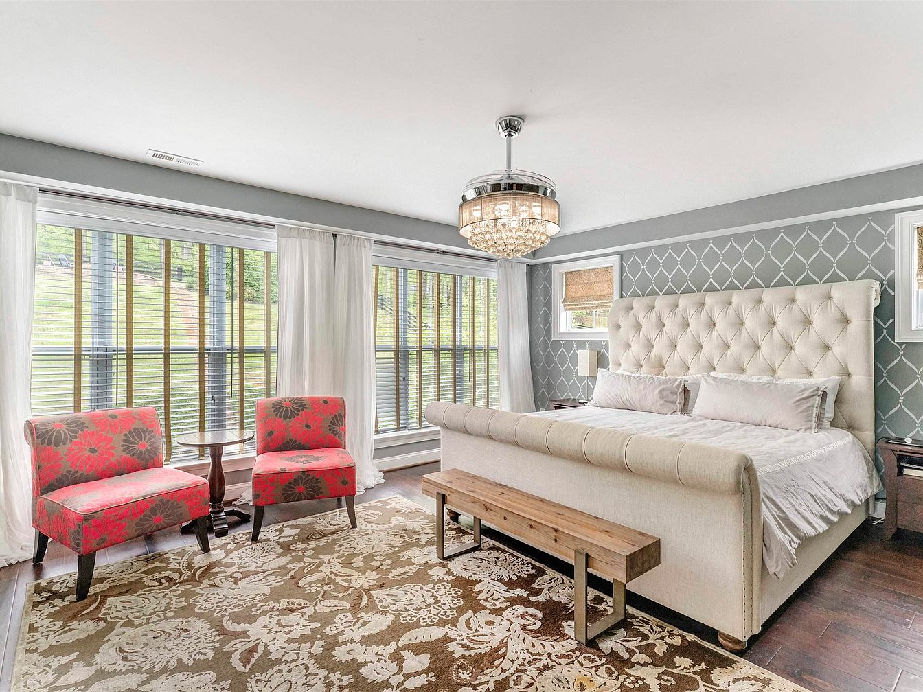This master bedroom features a sophisticated retreat with soft gray walls adorned with an elegant white trellis pattern, creating a subtle yet stylish backdrop. A cream-colored tufted sleigh bed anchors the room, complemented by crisp white bedding. On one side, two vibrant red and gray floral armchairs flank a small round wood table, offering a cozy seating nook next to expansive windows dressed in sheer white curtains and wood blinds, soaking the room in natural light. A large, intricately patterned area rug in beige and brown tones adds warmth atop dark hardwood floors. A rustic wooden bench with metal legs stands at the foot of the bed, balancing the space with natural textures. Above, a sparkling chandelier with crystal and metallic elements enhances the room’s polished ambiance.