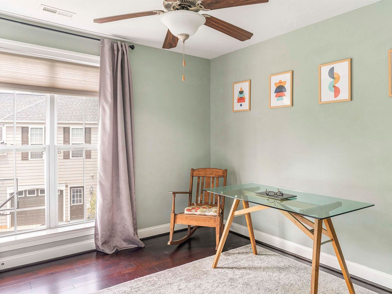 This tranquil home office corner features a soft sage green wall color, creating a calm atmosphere ideal for focus. Natural light streams through a large double window dressed with light beige blinds and muted lavender curtains, enriching the bright and airy feel. A sleek glass-top desk with wooden trestle legs brings modern simplicity, paired with a classic wooden rocking chair that adds warmth and a hint of rustic charm. Above the chair, four framed abstract art pieces in muted complementary tones add visual interest, while the dark hardwood floor and plush grey area rug ground the space with texture and depth.