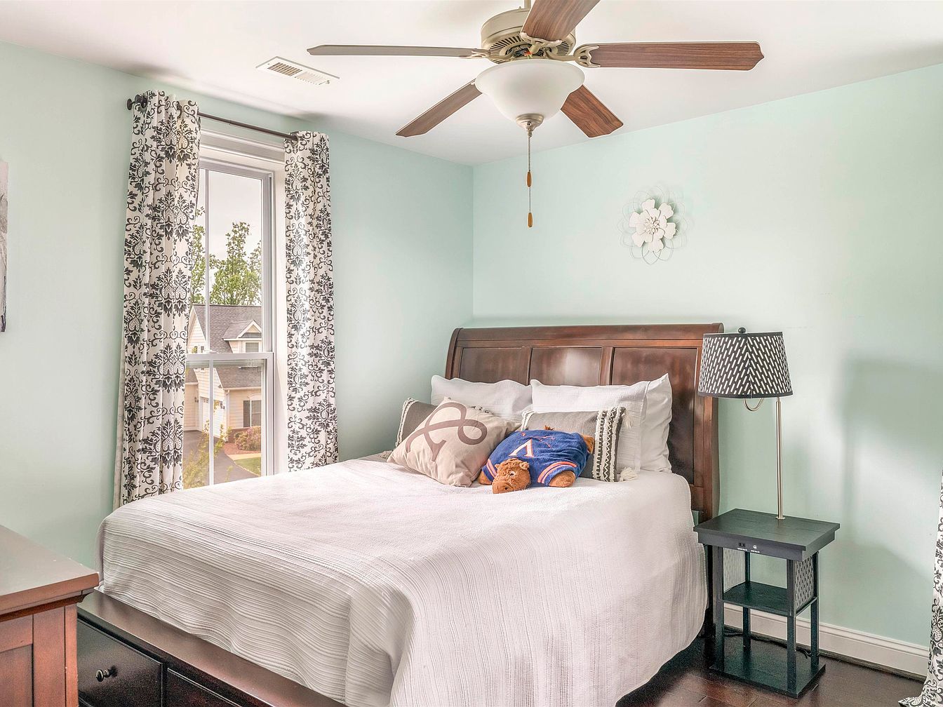 This cozy bedroom features a soothing light blue wall color that sets a calm, tranquil mood. A dark wood sleigh bed takes center stage, complemented by a white bedspread and an assortment of pillows in neutral and blue tones, including a playful plush toy that adds a personal touch. On one side of the bed, a black nightstand with open shelving supports a lamp with a patterned black and white shade, adding subtle contrast and texture. Natural light filters in through a tall window adorned with elegant black and white floral curtains, enhancing the room’s airy and welcoming ambiance. A ceiling fan with wood blades completes the space, balancing functionality with classic style.