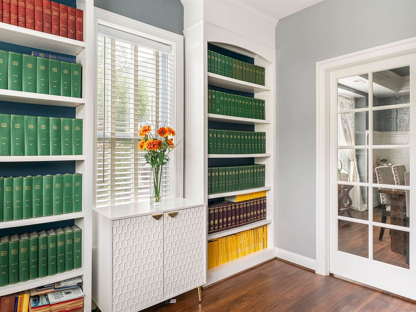 This cozy library corner features built-in white bookshelves that frame a window adorned with white blinds, allowing natural light to softly illuminate the space. The shelves hold numerous volumes, primarily in green and yellow bindings, imparting a classic and scholarly vibe. Below the window, a white cabinet with a textured hexagonal pattern and brass handles provides stylish storage. The walls are painted a calming gray, harmonizing with the warm wood flooring. Glass-paned French doors open into an adjacent room, visually expanding the space and enhancing the open, inviting atmosphere of this elegant reading area.