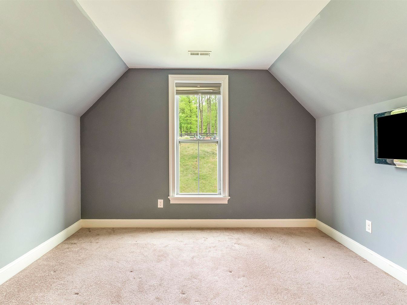 This attic space has a simple, clean layout with sloped ceilings that add character and coziness to the room. The walls feature a calm, muted blue-gray tone, with a darker accent wall surrounding a single, centered window that provides natural light and a view of greenery outside. Light beige carpeting covers the floor, contrasting softly with the wall colors while maintaining a neutral palette. Minimal trim in white runs along the baseboards, framing the room and giving it a finished touch. A wall-mounted television is present on the right side, suggesting a multifunctional use for relaxation or entertainment. Overall, the design is understated, emphasizing comfort and quaint charm.