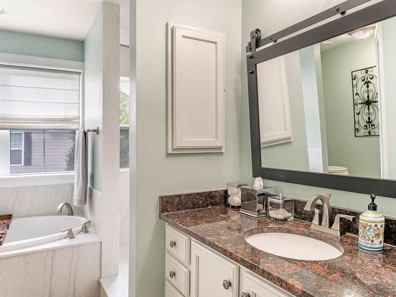 This bathroom features a sophisticated layout with a granite countertop vanity in rich, earthy tones paired with off-white cabinetry that provides ample storage. The large rectangular mirror above the sink is framed in a dark, matte frame fixed with a barn door-style sliding mechanism, adding a modern rustic touch. The walls are painted in a soft pale green, offering a calm and refreshing background. Adjacent to the vanity is a built-in bathtub surrounded by marble tiles, complemented by a window dressed with a white Roman shade, allowing diffuse natural light. A chrome towel bar holds a neatly folded white towel enhancing the clean, elegant ambiance.