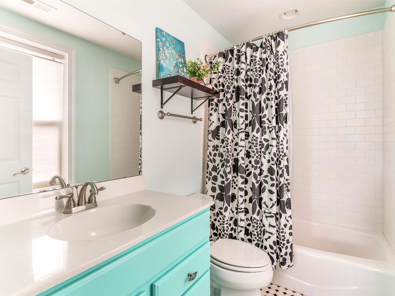 This bathroom features a refreshing light turquoise vanity with a smooth, white countertop and an integrated oval sink. A large rectangular mirror above the vanity enhances the sense of space, reflecting natural light from the window next to the door. The shower and bathtub combo is enclosed by a black and white floral patterned curtain, complementing the white subway tile surrounding the tub area. The hexagonal floor tiles add visual interest with their black and white design. A dark wood floating shelf above the toilet holds decorative plants and artwork, introducing a cozy, personal touch to the airy layout.
