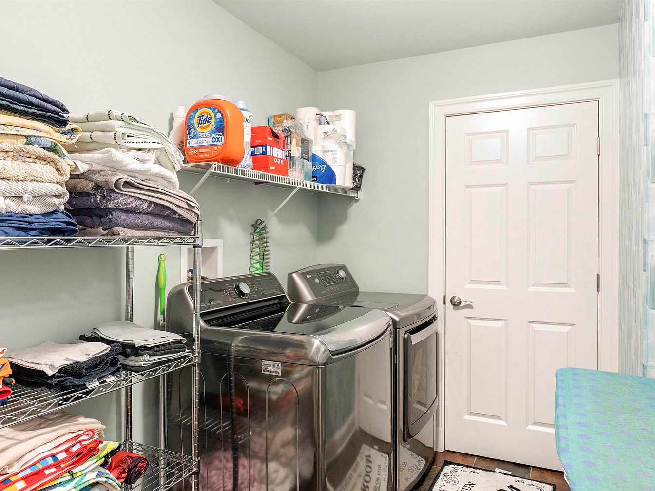 This compact laundry room features modern stainless steel washer and dryer units positioned side by side beneath a wall-mounted wire shelf stocked with cleaning supplies and paper goods. The adjacent metal shelving unit is neatly organized with folded towels and linens in neutral tones such as beige, cream, and gray, alongside some colorful items, offering practical storage while keeping essentials within easy reach. The walls are painted a soft, light gray, creating a calming backdrop, while a white paneled door adds a clean, classic architectural detail. A turquoise ironing board with a subtle pattern adds a pop of color, complementing the bright and tidy functionality of this space.