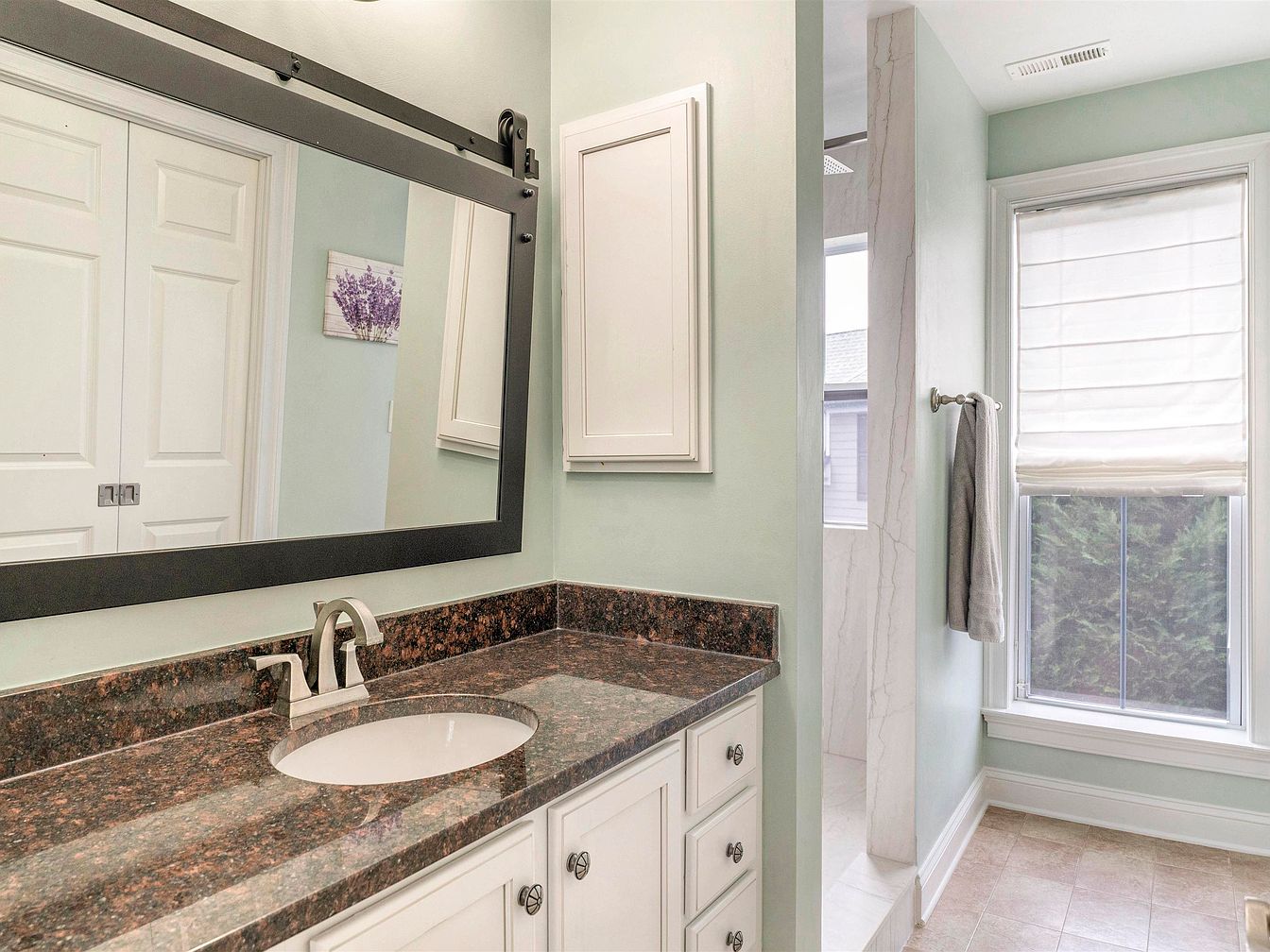 This bathroom section features a sleek vanity with a granite countertop in rich brown tones, paired with a white undermount sink and brushed metal faucet. The cabinetry below is painted in a soft white, complementing the pale, muted green walls that lend a calm ambiance. A large, rectangular mirror with a thick dark frame hangs above, mounted with industrial-style hardware. Adjacent to the vanity is a small white cabinet recessed into the wall for storage. Natural light filters through a window dressed with a white Roman shade, softly illuminating the light-toned tile floor and nearby tiled shower wall, adding to the space’s inviting, clean look.