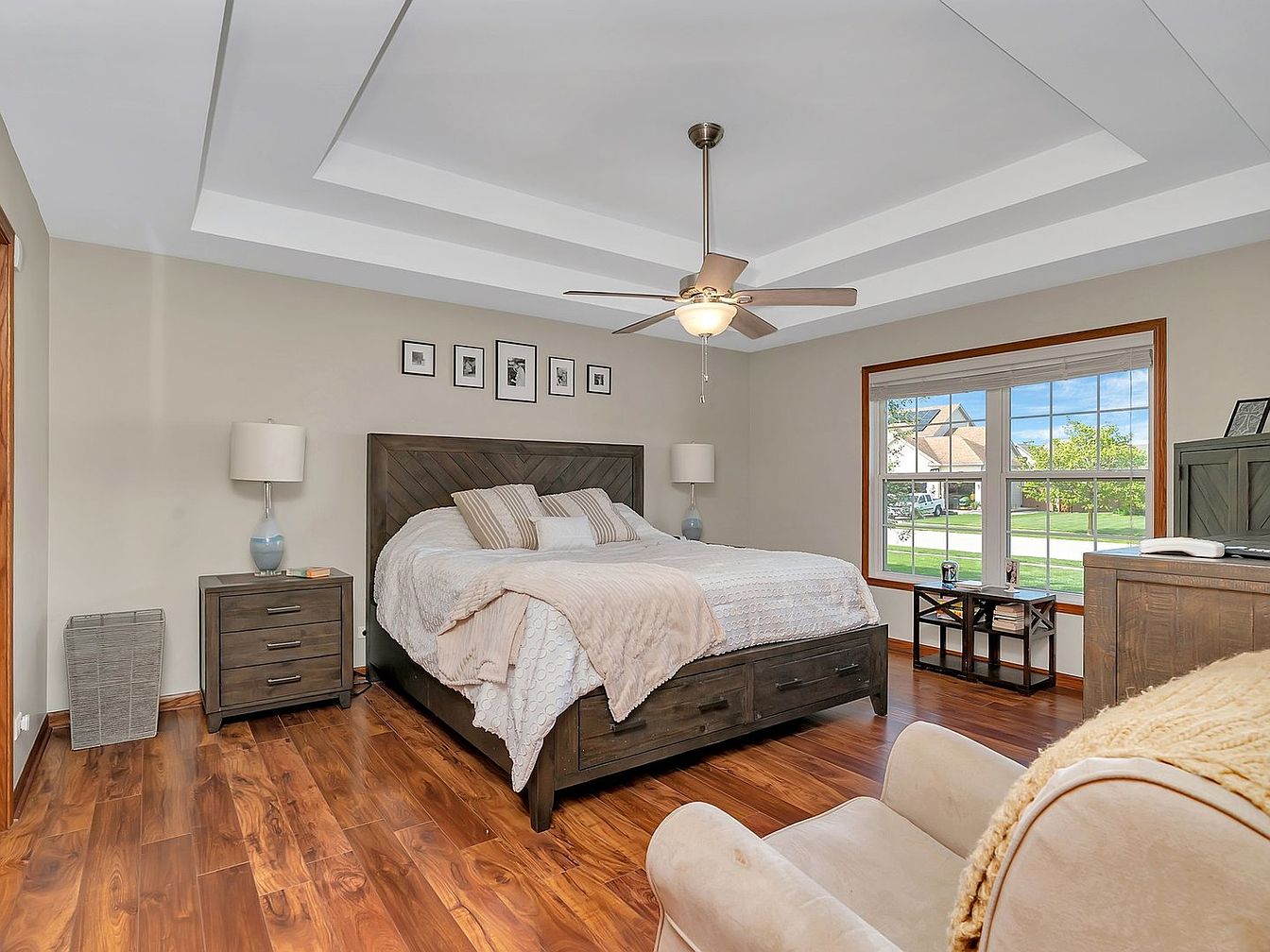 This spacious master bedroom features warm wood flooring complemented by neutral beige walls and white ceiling with a refined recessed tray design. The dark wood bed frame with matching nightstands adds a sturdy, cohesive look, accented by soft bedding in creamy hues and striped pillows. Two classic table lamps with blue ceramic bases frame the bed, providing balanced lighting. A large window with wood trim allows plentiful natural light, enhancing the room’s airy atmosphere. Additional furniture includes a small black shelf under the window and a cozy beige armchair with a textured throw, creating a serene, inviting retreat.