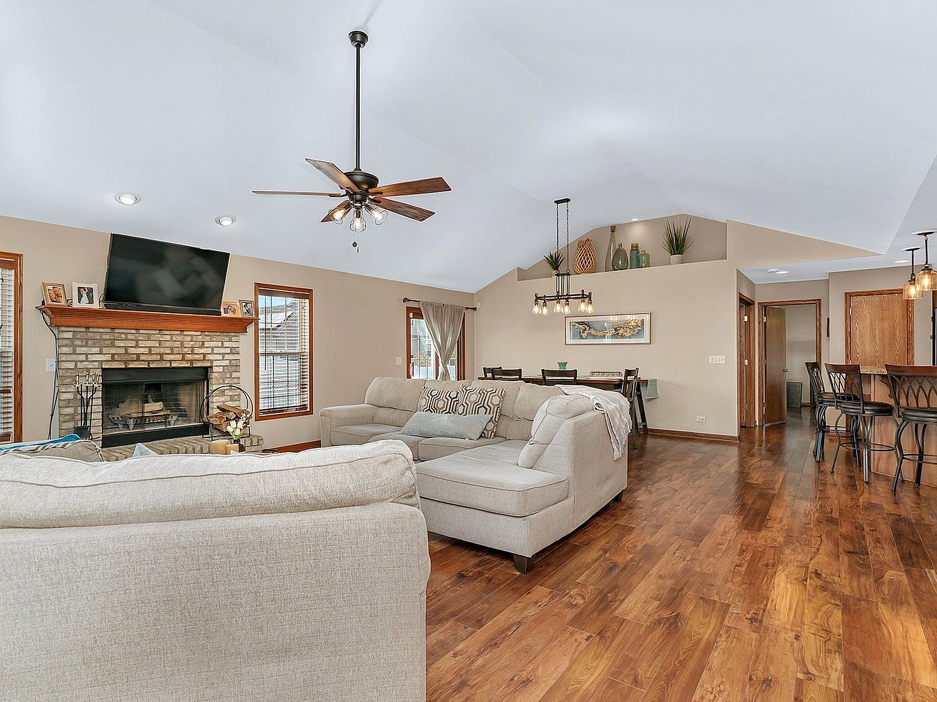 This open-plan living room and dining area features warm hardwood floors that contrast beautifully with neutral beige walls. A vaulted ceiling painted white adds spaciousness and light, complemented by the large windows on either side of a brick fireplace, which anchors the room with rustic charm. Positioned above the mantel is a flat-screen TV, framed by small photo displays. Plush, light-gray sectional sofas create an inviting seating space. In the dining nook, a dark wood table sits beneath a black, industrial-style light fixture. Decorative accents on a ledge highlight greenery and ceramics, enhancing the cozy yet stylish ambiance.