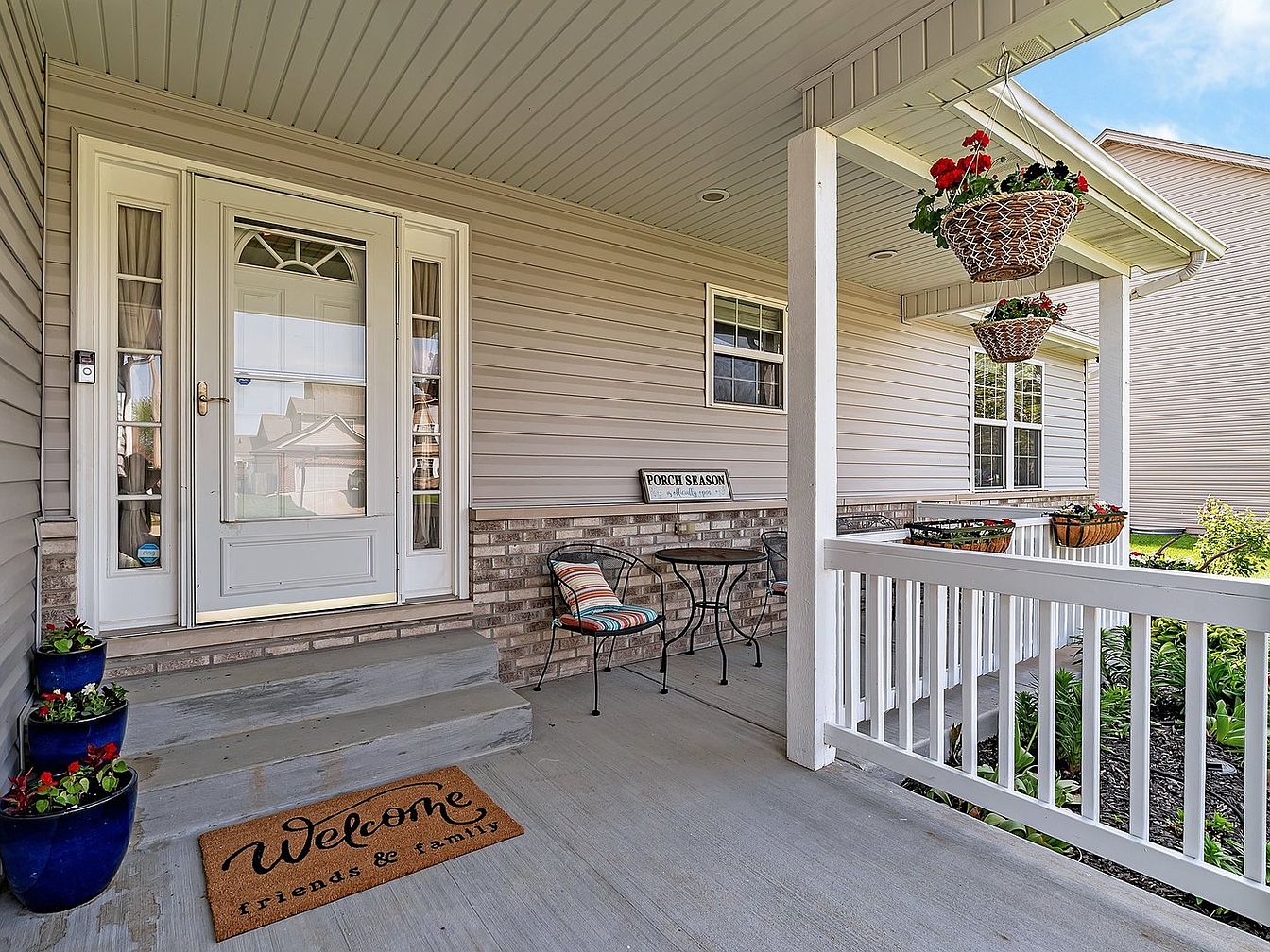 This inviting front porch features a cozy sitting area with two elegant wrought iron chairs accented by striped cushions and a matching round table, perfect for relaxing or enjoying a morning coffee. The porch’s neutral color palette combines light beige siding with a complementing brick half-wall and a soft grey concrete floor and steps. White railing and columns provide classic architectural detail, while hanging flower baskets and potted plants add vibrant pops of red and green, enhancing the welcoming atmosphere. A charming ‘Welcome friends & family’ doormat and a “Porch Season” sign complete this warm, homey entry space.