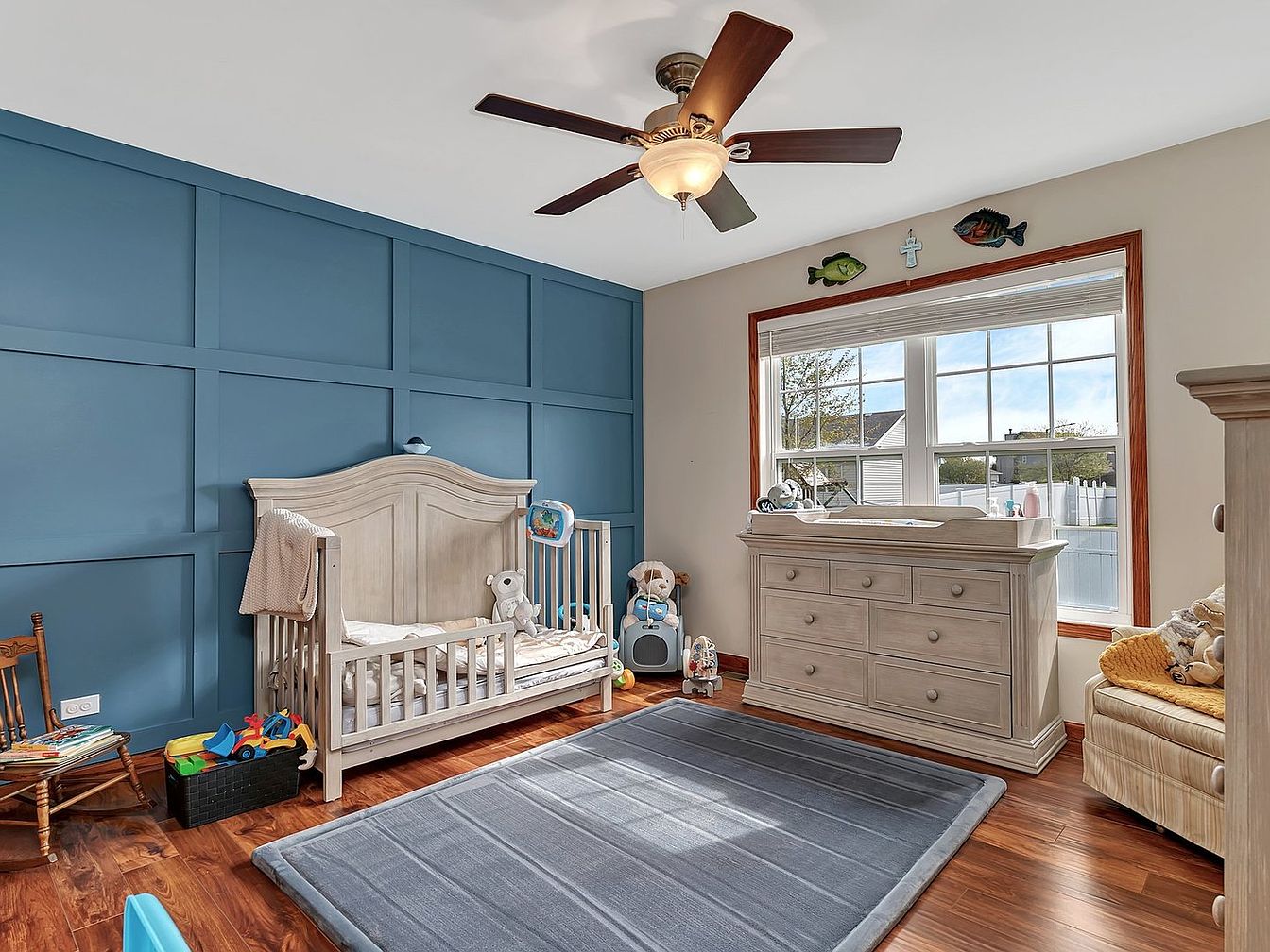 This cozy children’s bedroom features a calming blue accent wall with a textured grid pattern, creating depth and visual interest. The natural wood floor adds warmth to the space, complemented by a large, soft blue area rug. A wooden toddler bed with a curved headboard sits against the blue wall, adorned with plush toys that add a playful touch. Opposite the bed, a wide wooden dresser with a changing pad provides practical storage and functionality. A sizable window framed in warm wood allows natural light to fill the room, enhancing the inviting and restful atmosphere. The ceiling fan with wooden blades brings a traditional element, completing this well-balanced, child-friendly design.