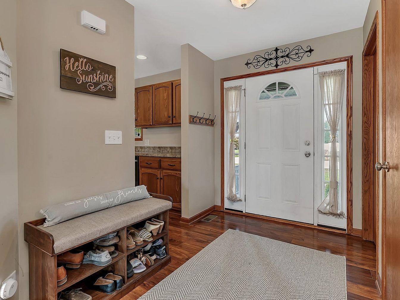 This welcoming entryway features a light beige wall palette complemented by rich, medium-toned hardwood floors that add warmth. A white front door with small window panes on either side allows natural light to filter through sheer curtains, creating an inviting glow. The door is framed by natural wood trim which harmonizes with the kitchen cabinetry visible just beyond. A wooden shoe bench with a cushioned seat and a long pillow inscribed with friendly text offers practical storage beneath while encouraging comfort. Above the door, decorative iron scrollwork adds a subtle touch of elegance, blending rustic and traditional styles gracefully.