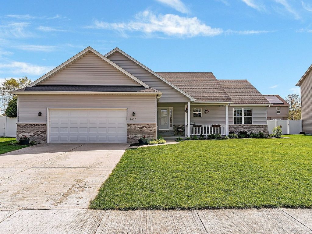 This well-maintained ranch home is located in the desirable Farmstone at Diamond subdivision in Diamond, Illinois. Featuring a classic ranch architectural style, the home is characterized by its single-story layout and a functional, open floor plan. The exterior showcases a blend of light-colored siding with brick accents, a gabled roof, and a welcoming covered front porch, contributing to its charming curb appeal. Built with comfort and functionality in mind, the house includes an attached 2-car garage and a full deep-pour unfinished basement, which offers ample storage space and a foundation for potential future living space. The interior living space benefits from a vaulted ceiling in the living room, a cozy wood-burning fireplace with a gas starter, and an open design that flows from the living area to the dining room and kitchen. The kitchen is equipped with abundant cabinetry, a central island with breakfast bar seating, and modern black stainless steel appliances, ideal for the home chef. The primary suite is a private retreat, featuring trayed ceilings, an en suite bathroom with a large vanity, deep soaking tub, a separate shower, and a spacious walk-in closet. There are three additional bedrooms, with one currently used as a home office or den, providing great flexibility for different needs. Additional functional spaces include a mudroom and laundry room located beside the garage, enhancing everyday convenience. The backyard is fully fenced for privacy and includes a stamped and dyed concrete patio accessible through sliding glass doors from the dining area, perfect for outdoor entertaining or relaxing. While the specific year built and recent renovation details are not mentioned, the home appears to be in excellent condition and well cared for. It sits on a well-kept plot with a neatly manicured lawn and is located just minutes from the interstate, providing excellent commuter access within a quiet neighborhood. The listing price for this beautiful ranch home is $375,000.