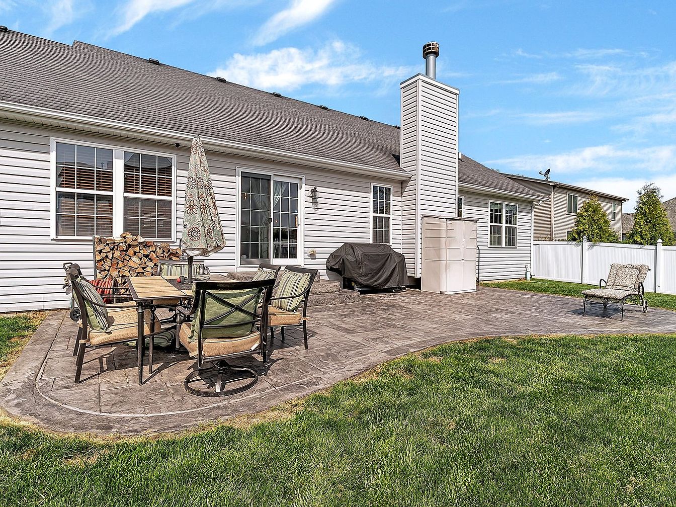 This backyard patio features a stamped concrete surface with a smooth, subtle texture that complements the surrounding green lawn. It extends from the rear of a white vinyl-sided house, which is equipped with several double-hung windows and a sliding glass door leading indoors. A dining set with cushioned chairs and a floral-patterned umbrella offers an inviting space for outdoor meals. A gas or charcoal grill with a cover is positioned near a vertical chimney, adding functionality and warmth to the space. The layout is open, practical, and ideal for relaxing or entertaining in a suburban setting.