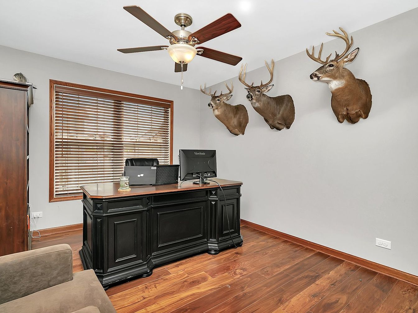 This home office features a spacious layout with warm wood floors and matching wood-trimmed window blinds that add a touch of natural elegance. The black executive desk with a polished wood top commands the center of the room, paired with a comfortable black office chair placed in front of a window for natural light. A ceiling fan with wooden blades and a frosted glass light provides overhead illumination. On one wall, three large deer head mounts serve as a focal point, contributing a rustic, outdoorsy character to the otherwise modern, clean design.