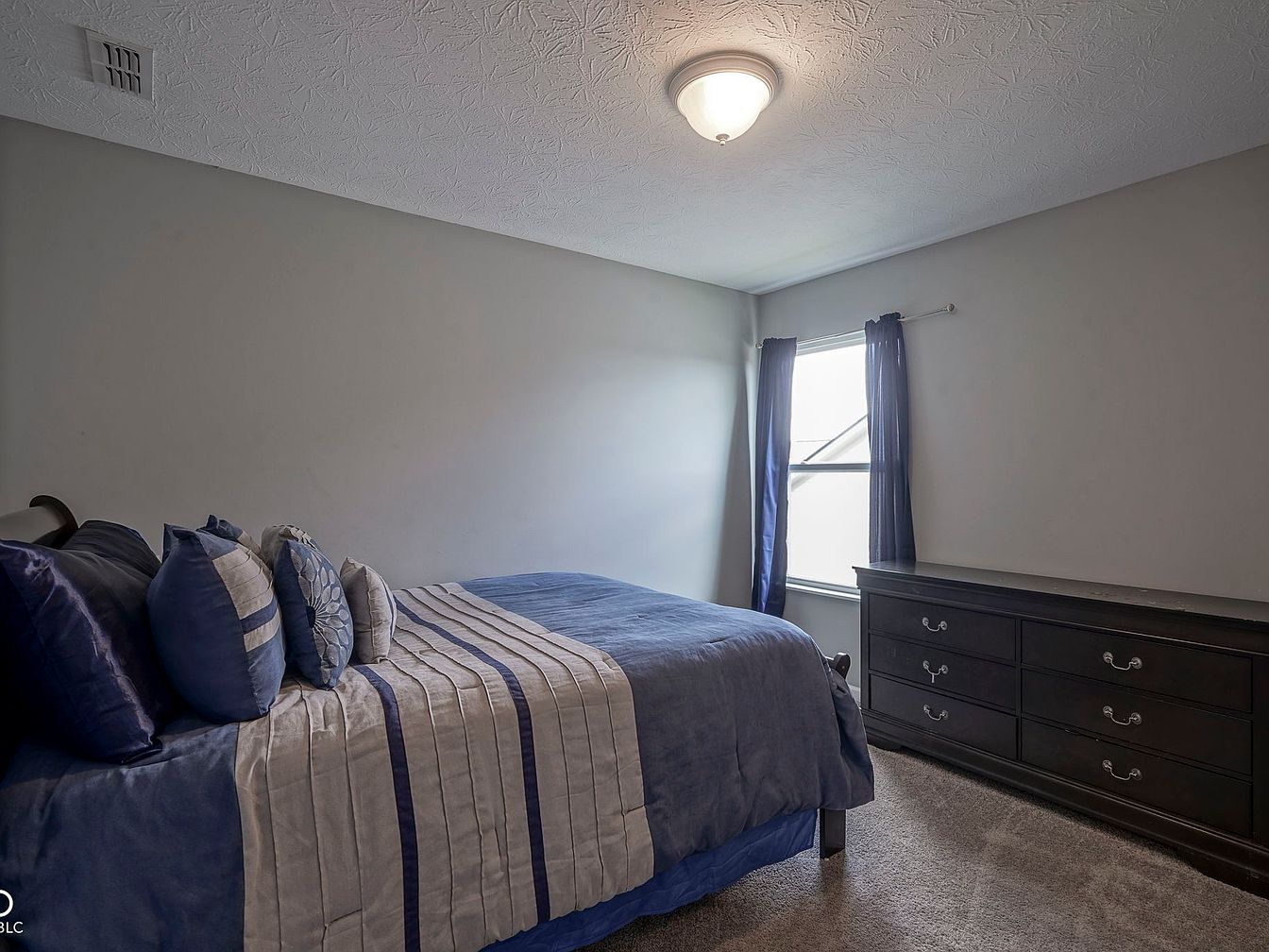 This bedroom features a calm and neutral color palette with light gray walls and beige carpeting, promoting a serene atmosphere. A queen-sized bed is dressed in a blue and beige striped comforter with matching pillows that add texture and subtle pattern. Positioned opposite the bed is a large, dark wood dresser with elegant drawer pulls, providing ample storage space. Natural light filters through a window framed with deep blue curtains, balancing the room’s tones. The ceiling is finished with a simple white textured design, highlighted by a central flush mount light fixture that softly illuminates the space, creating a cozy and inviting feel.