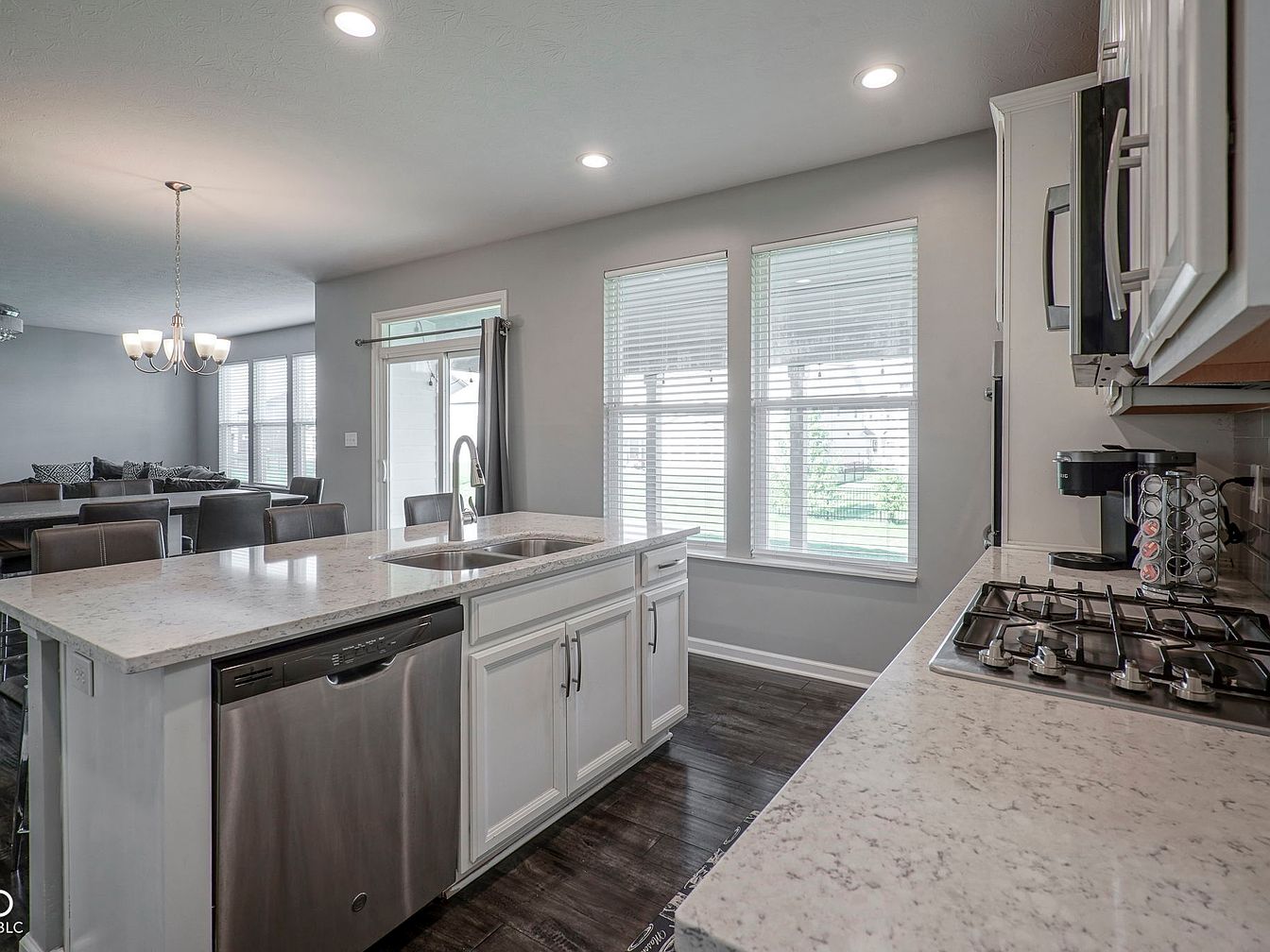 This open kitchen features a modern island with white cabinetry and a sleek, light granite countertop, which incorporates a stainless steel sink and dishwasher beneath. The countertops extend along the adjacent wall, housing a gas stovetop and various small appliances, such as a coffee machine and spice rack. The space is illuminated by recessed lighting and natural light from two large windows with white blinds, enhancing the casual, yet polished, gray wall tones. The kitchen flows seamlessly into the dining and living areas, where a metal chandelier highlights a long dining table surrounded by upholstered chairs, creating a cohesive and airy layout. Dark wood flooring contrasts beautifully with the lighter surfaces, providing warmth and depth to this contemporary culinary and gathering space.
