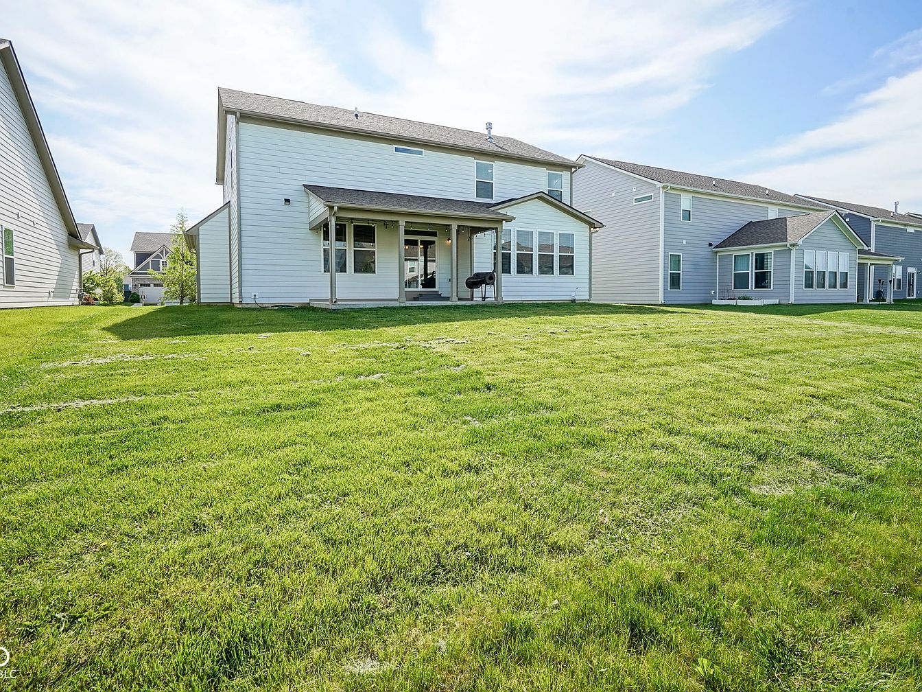 This impressive home, located in the highly desirable Bridger Pines subdivision of Fishers, Indiana, exemplifies a modern Craftsman architectural style with its charming gabled rooflines, mixed siding textures, and a welcoming front porch. Built recently and featuring like-new condition, this spacious 4-bedroom, 2.5-bathroom residence spans an expansive 3,730 square feet, offering a bright and open floorplan designed to maximize natural light. Key interior highlights include a cozy gas fireplace in the Great Room, a gourmet kitchen outfitted with premium stainless steel appliances such as double ovens and a gas cooktop, and a large center island that seamlessly connects with the dining space for easy entertaining. The main level also boasts a refined office with double glass doors, ideal for remote work or study. The semi-finished basement, equipped with two egress windows, framed walls, electrical runs, and drywall materials, presents a perfect opportunity for customization, whether for a full bath, wet bar, or additional living space. Outside, a covered back patio overlooks a generous yard, perfect for outdoor relaxation or gatherings. Residents of this vibrant community enjoy exclusive access to amenities including a pool, clubhouse, playground, and scenic walking trails that connect directly to Flat Fork Park. Priced competitively at $525,000, this home combines luxury, comfort, and lifestyle within one of Fishers’ most sought-after neighborhoods.