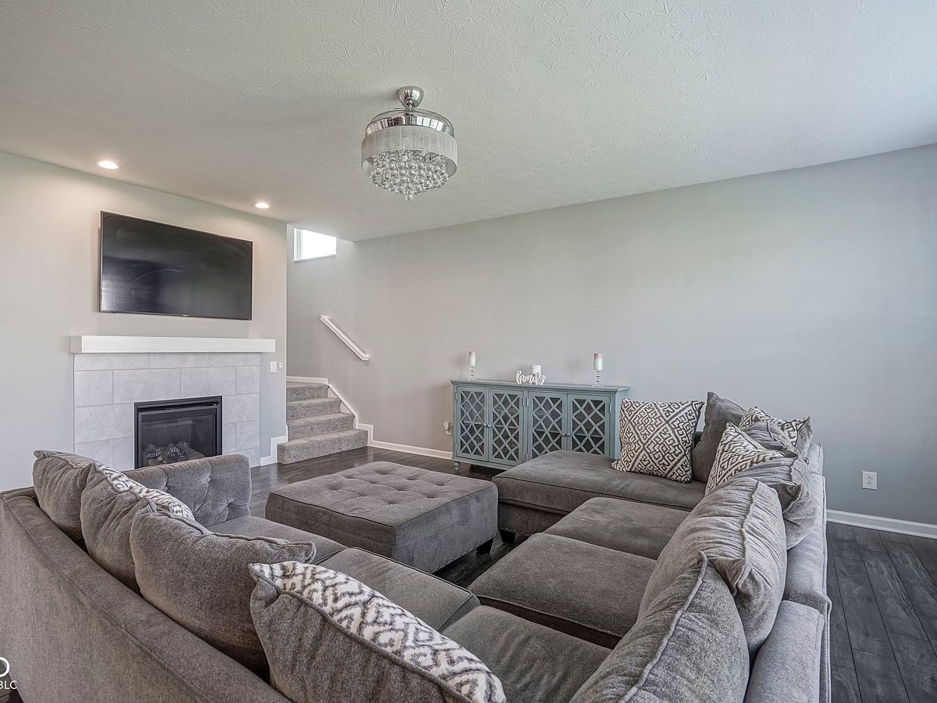 This living room features a spacious sectional sofa upholstered in a soft gray fabric, balanced with decorative throw pillows showcasing geometric patterns in neutral tones. The sectional faces a fireplace with a light gray tiled surround, topped by a sleek white mantel supporting a wall-mounted flat-screen television. The room exhibits a modern, minimalist aesthetic with light gray walls and dark wood flooring, creating a calm and cozy ambiance. A crystal-accented ceiling light adds an elegant touch, while a blue cabinet against the wall offers subtle color contrast and storage, enhancing functionality without overwhelming the space.