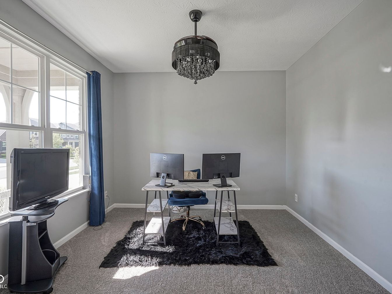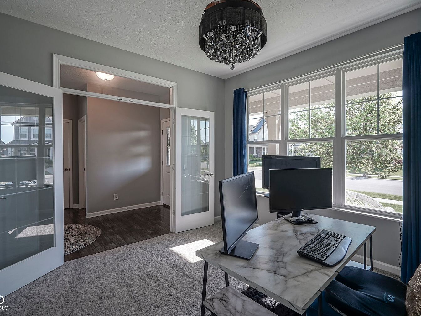 This home office features a tranquil color palette of soft gray walls contrasted by white trim and trim accents. The room benefits from abundant natural light through large windows dressed with rich navy blue curtains that frame the views outside. A sleek marble-patterned desk holds dual computer monitors and accessories, providing a modern and efficient workspace. The flooring transitions from plush gray carpet in the office area to dark wood in the adjacent entryway, marked by glass French doors enhancing openness and allowing light to carry through. A striking black crystal chandelier adds a touch of elegance and sophistication to the overall serene and functional design.