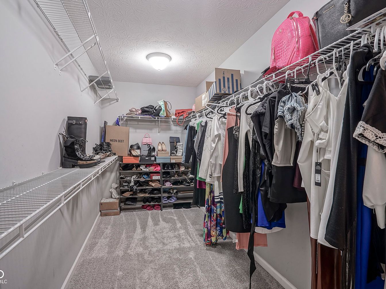 This spacious walk-in closet features organized open wire shelving running along both sides, providing ample storage for hanging clothes and shoe racks. The neutral gray carpeting adds warmth to the otherwise minimalist space, while the light gray painted walls maintain a clean and modern feel. The ceiling light fixture illuminates the length of the closet well, accentuating the diverse assortment of clothing and accessories, including footwear, handbags, and folded items on upper shelves. This functional and tidy design maximizes storage potential with easy access to all wardrobe essentials in a compact, orderly setting.