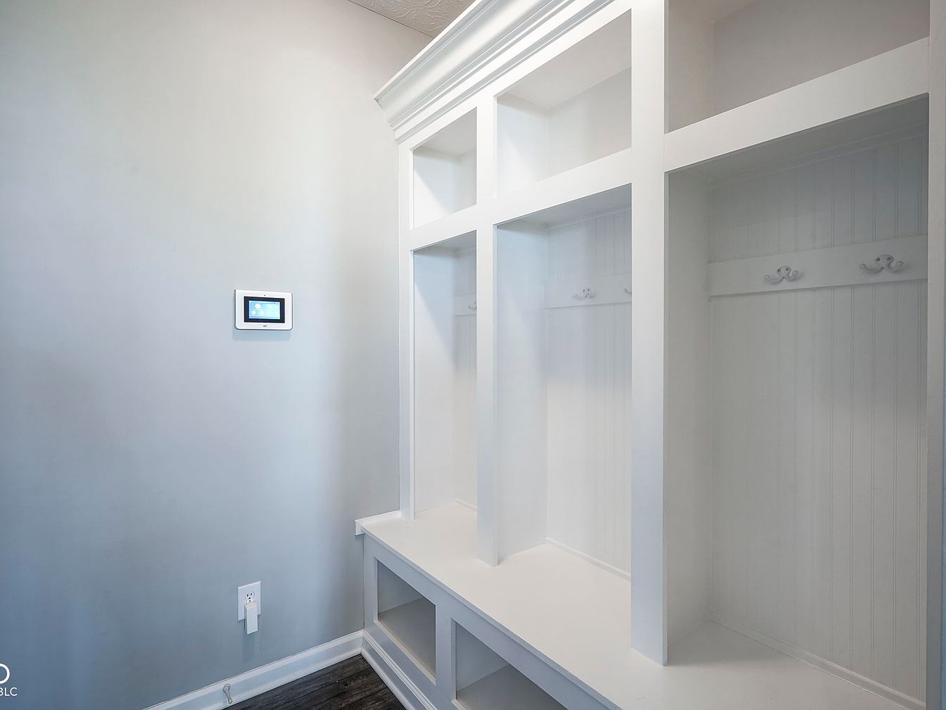 This entryway mudroom features a clean, organized design with built-in bench seating and partitioned cubbies above and below for ample storage. The white cabinetry with beadboard paneling and decorative hooks offers a classic yet functional aesthetic, perfect for storing coats, bags, and shoes. The soft gray wall color contrasts subtly against the bright white built-ins, enhancing natural light reflection and creating an airy atmosphere. Dark wood flooring adds depth and warmth to the space. A wall-mounted digital thermostat or control panel balances modern convenience with timeless craftsmanship, making this mudroom both practical and inviting.