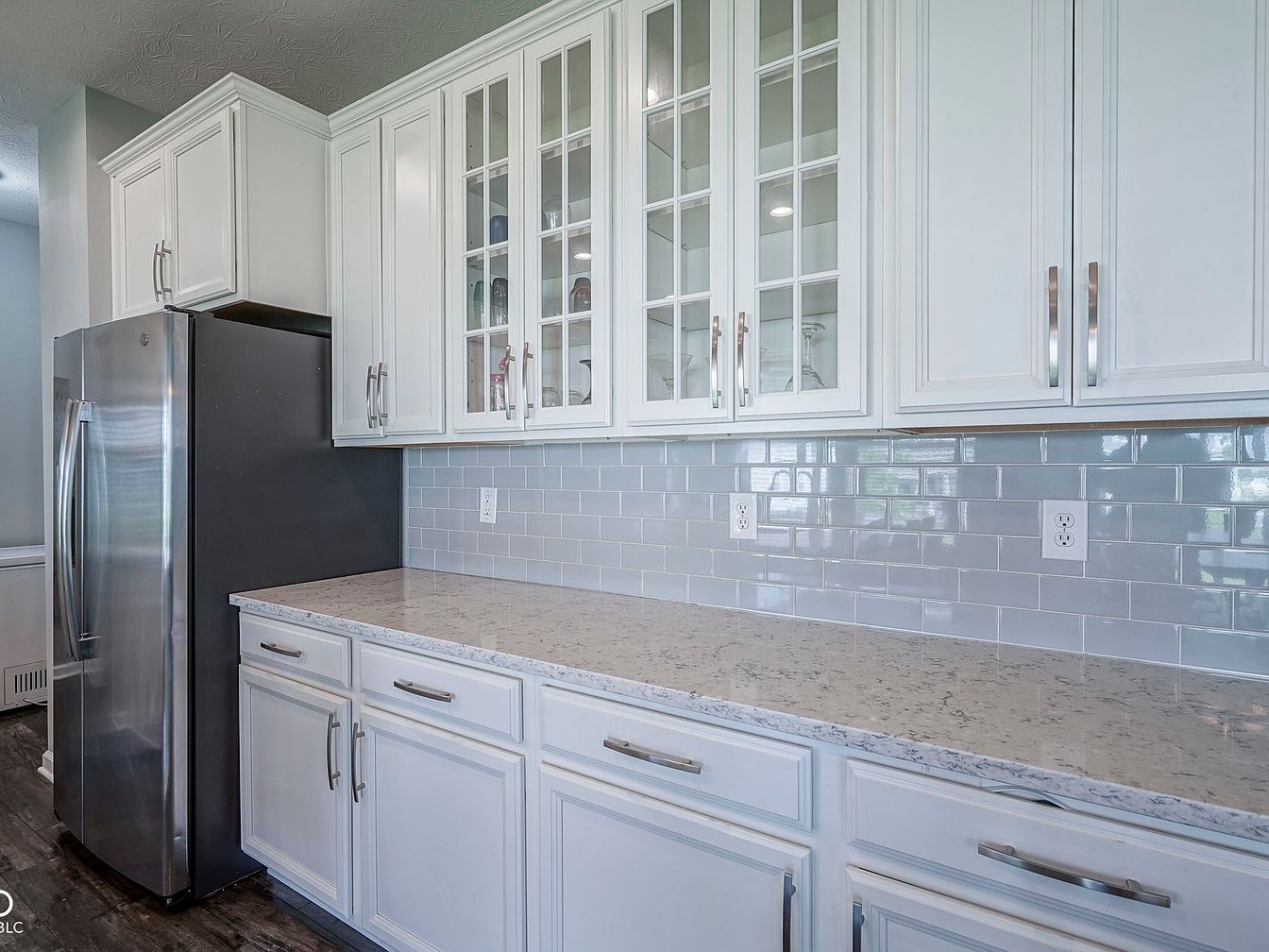 This section of the kitchen highlights a clean, contemporary design featuring white cabinetry with sleek silver handles. The upper cabinets include glass paneled doors adding an elegant touch and a sense of openness, while lower cabinets provide ample storage. A light gray subway tile backsplash with a glossy finish contrasts subtly against the white cabinets and complements the speckled, light-colored quartz countertop, which offers a durable and stylish workspace. The dark wood flooring adds warmth and depth, while the stainless steel refrigerator introduces a modern metallic element to the overall bright and airy aesthetic.
