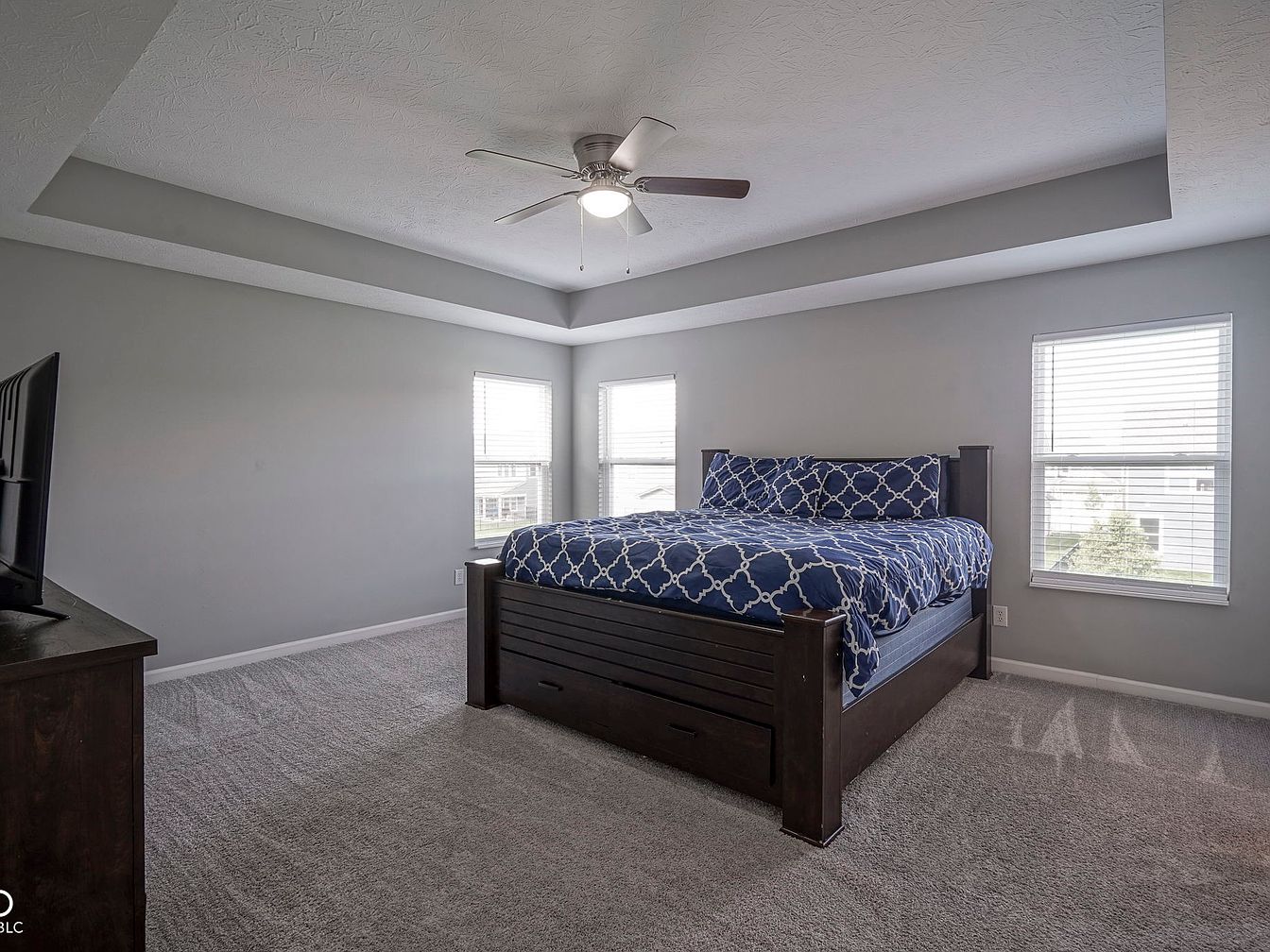 This master bedroom features a large, dark wood bed framed by a sleek headboard and footboard with built-in storage drawers underneath. The bed is dressed in blue bedding with a white geometric pattern, adding a touch of modern style. Soft gray walls and matching carpet create a calm and neutral backdrop, enhanced by natural light filtering through three evenly spaced windows adorned with white blinds. The ceiling has an attractive tray design with a brushed metal ceiling fan and light fixture, providing both functional lighting and a contemporary architectural detail.