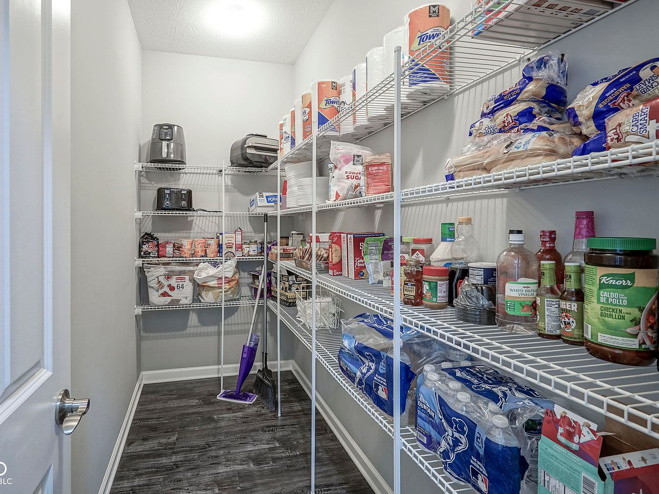 This pantry features a practical, organized layout with white wire shelving lining both sides of the narrow room. The shelves hold an array of food staples, kitchen appliances, and essentials—such as canned goods, bottled condiments, paper products, and small kitchen gadgets neatly arranged for easy access. The walls are painted a soft neutral tone, creating a clean and bright backdrop that contrasts with the dark wood-look flooring, lending warmth to the space. The ceiling exhibits subtle texture, and the room’s layout maximizes vertical storage, making efficient use of the compact area.