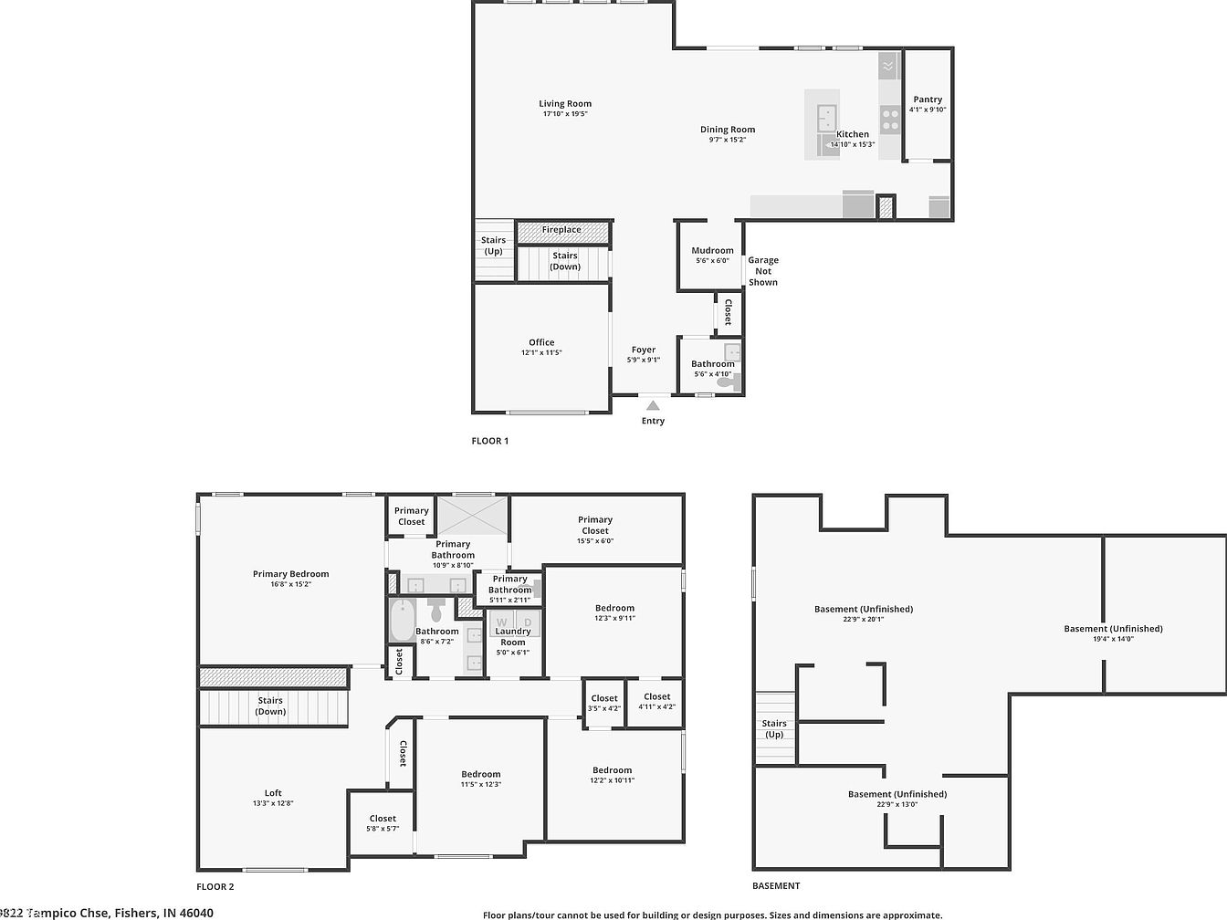 This detailed floor plan reveals a spacious three-level home layout. The main floor hosts an open-concept living area combining the living room, dining room, and kitchen with an adjacent pantry and mudroom. A foyer leads to a small bathroom, office space, and stairs connecting all levels. Upstairs, the primary bedroom features a large walk-in closet and en-suite bathroom. Three additional bedrooms, a loft, laundry room, and shared bathroom complete the second floor. The basement is unfinished and open, offering flexible space for future customization. The design emphasizes functional flow and practical storage throughout the home.