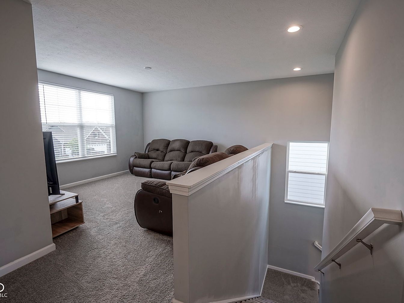 This upstairs family room features a cozy layout with a reclining sectional sofa in a rich brown tone, positioned to face a flat-screen TV on a simple wooden stand. The room is carpeted in a soft, neutral beige, enhancing comfort and warmth. Walls are painted a calming light gray, complementing the white trim and stair railing visible on the right side. Natural light floods in through a large window with white blinds, brightening the space, while recessed ceiling lights provide ample illumination. The partial wall encloses the stairwell, maintaining openness while defining the living area.
