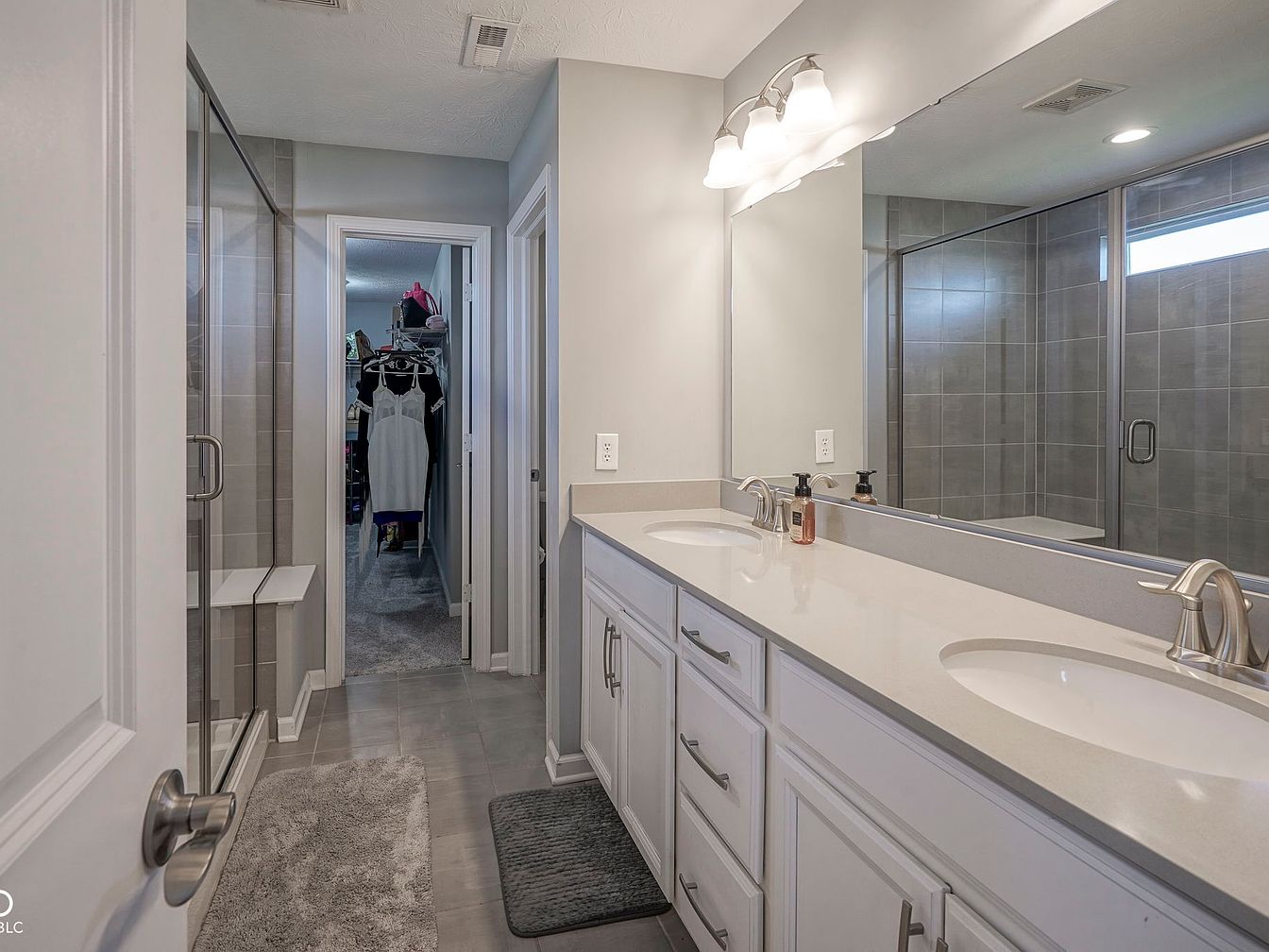 This bathroom features a long double-sink vanity with white cabinetry and sleek silver hardware. The countertop is a smooth, light-colored surface that enhances the clean and fresh ambiance. Above the sinks, a large mirror extends the width of the vanity, illuminated by modern wall-mounted lights with frosted glass shades. The floor is covered in large, neutral-toned tiles that match the tiled, glass-enclosed shower visible on the left. The shower has a built-in bench and a high window for natural light. Ahead, a doorway leads to a carpeted walk-in closet, adding functional convenience to the space.
