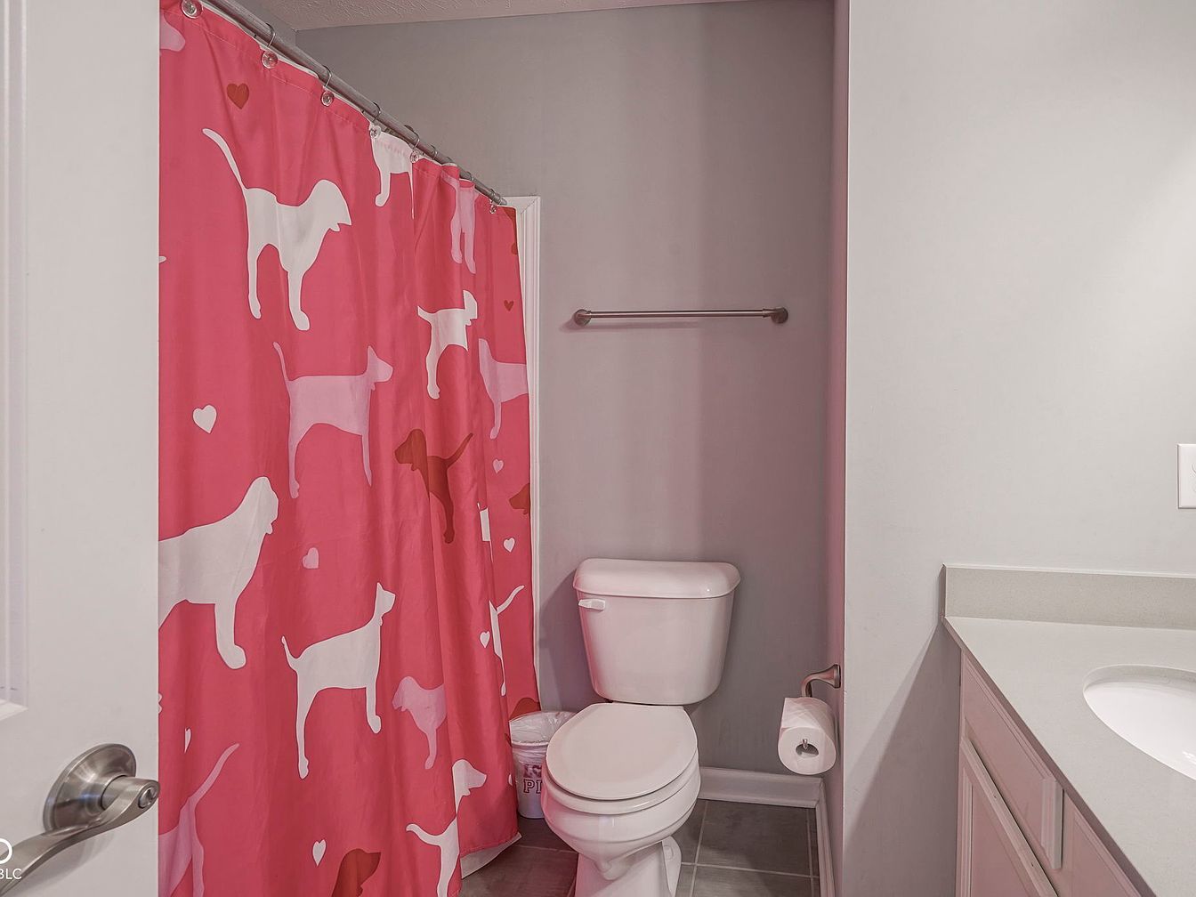 This compact bathroom combines simplicity with a playful touch. The walls are painted in a muted gray tone, creating a neutral backdrop that complements the clean white fixtures. A white toilet sits adjacent to a vanity with a light-colored countertop and cabinetry that maintains the room’s understated palette. A metal towel bar is mounted on the wall above the toilet, offering practical convenience. Adding personality and warmth to the space, a bright pink shower curtain adorned with various dog silhouettes and small hearts injects a whimsical and cozy vibe, contrasting nicely with the subdued surroundings.