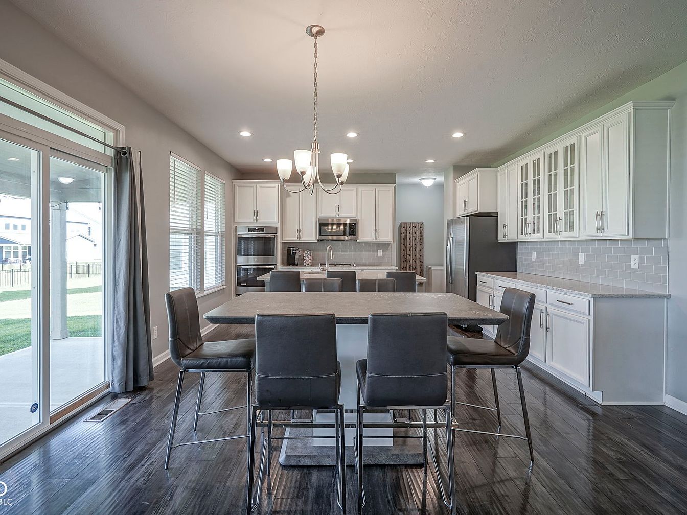 This spacious kitchen integrates a contemporary dining area featuring a wide rectangular island with a sleek gray countertop. The island is surrounded by six high-back black leather chairs, providing ample seating. The kitchen cabinets are painted white with silver hardware, complemented by a pale gray subway tile backsplash. Stainless steel appliances, including a double oven and a refrigerator, blend seamlessly. Large windows and sliding glass doors on one side flood the space with natural light, enhancing the light, neutral walls and dark hardwood flooring. Recessed lighting and a modern chandelier add warmth and elegance to the area.