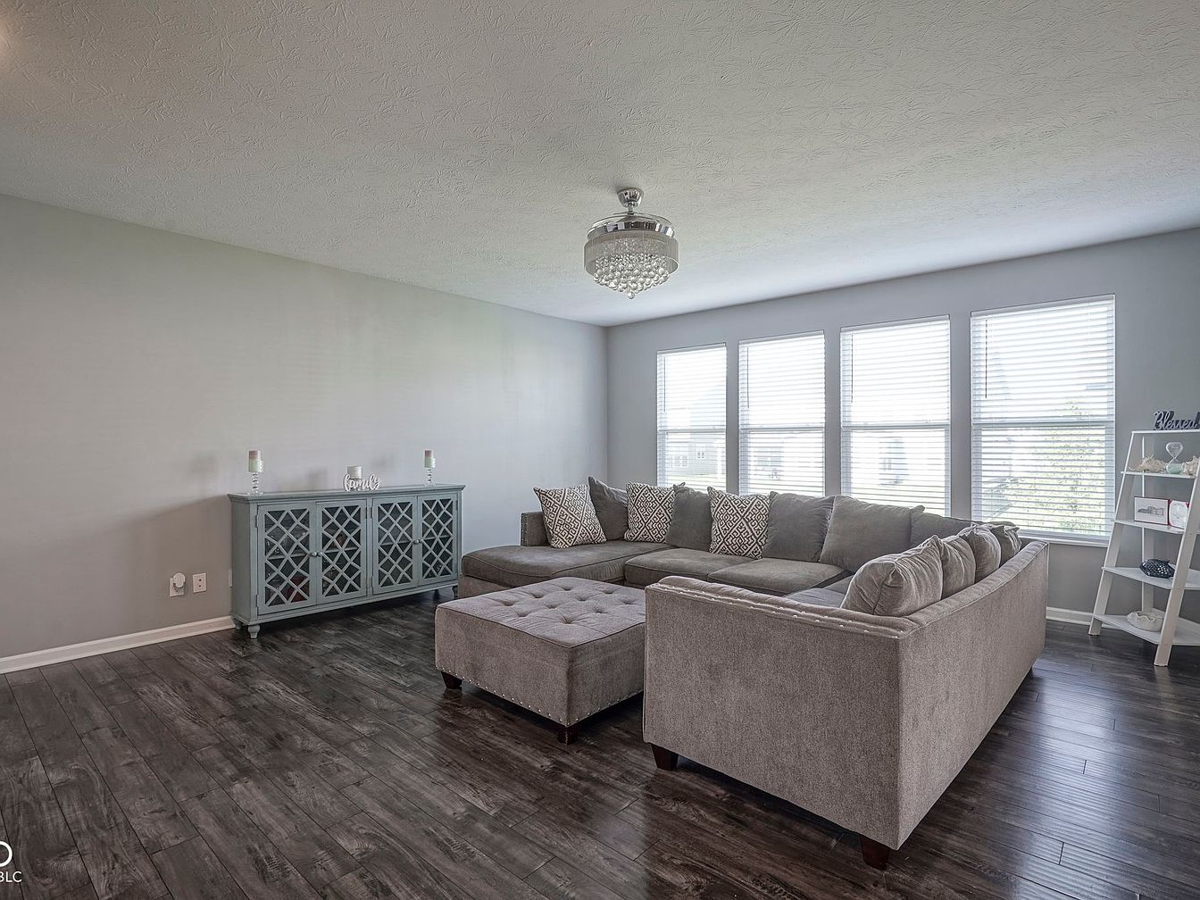 This spacious living room features a modern yet cozy aesthetic with a large sectional sofa in muted grey upholstery, complemented by several patterned throw pillows. The room is brightened by four large windows with white blinds, allowing ample natural light to flood the space. Dark wood plank flooring adds warmth and contrasts subtly with the light grey walls, keeping the atmosphere neutral and serene. A chic crystal chandelier hangs from the ceiling, adding an elegant touch. Furnishings include a tufted ottoman matching the sofa, a light blue sideboard with lattice details, and a white minimalist ladder shelf displaying decorative items.