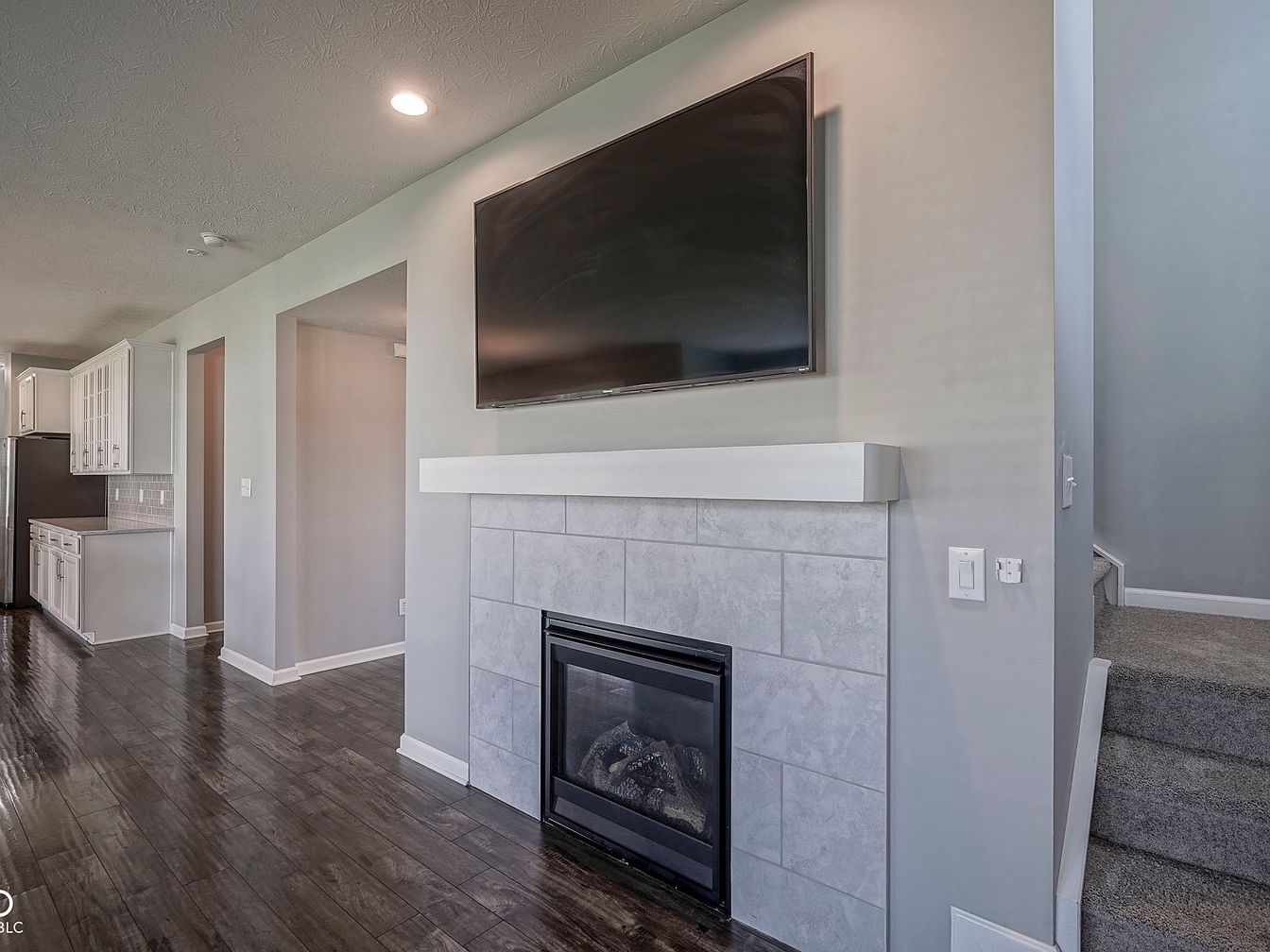 The living room centers around a modern fireplace with a clean-lined white mantel and large, light gray stone tiles that create a refined focal point. Above the fireplace is a flat-screen TV, mounted flush to the wall, blending technology with comfort. The walls are painted in a soft gray tone, complementing the darker hardwood floors that run throughout the space, adding warmth and depth. To the left, an adjacent kitchen area features white cabinetry and a pale backsplash, enhancing the cohesive neutral color palette. The carpeted stairs on the right bring texture and softness to the entry, inviting movement within this elegant yet functional living space.