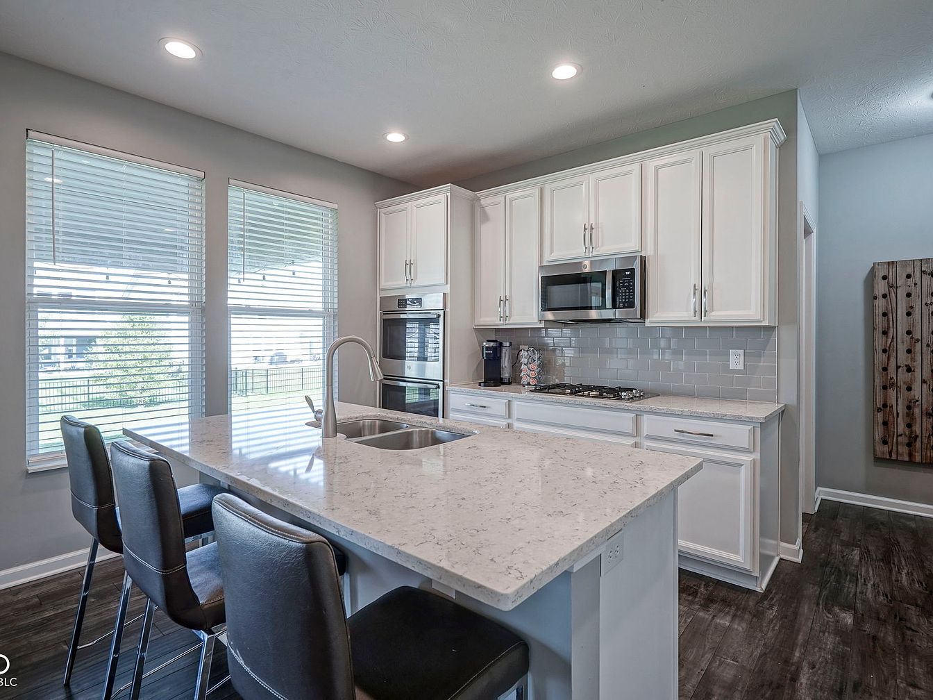 This sleek kitchen features a large island with a polished light marble countertop, incorporating a built-in double sink and a modern, curved faucet. Three black leather bar stools with chrome legs provide seating along the island, fostering a casual dining or social space. White cabinetry extends across one wall, offering ample storage and housing stainless steel appliances including a built-in microwave, oven, and gas cooktop. A glossy light gray subway tile backsplash adds subtle texture while complementing the soft gray walls. The dark wood flooring anchors the space, blending contemporary and classic elements for a bright, functional kitchen.