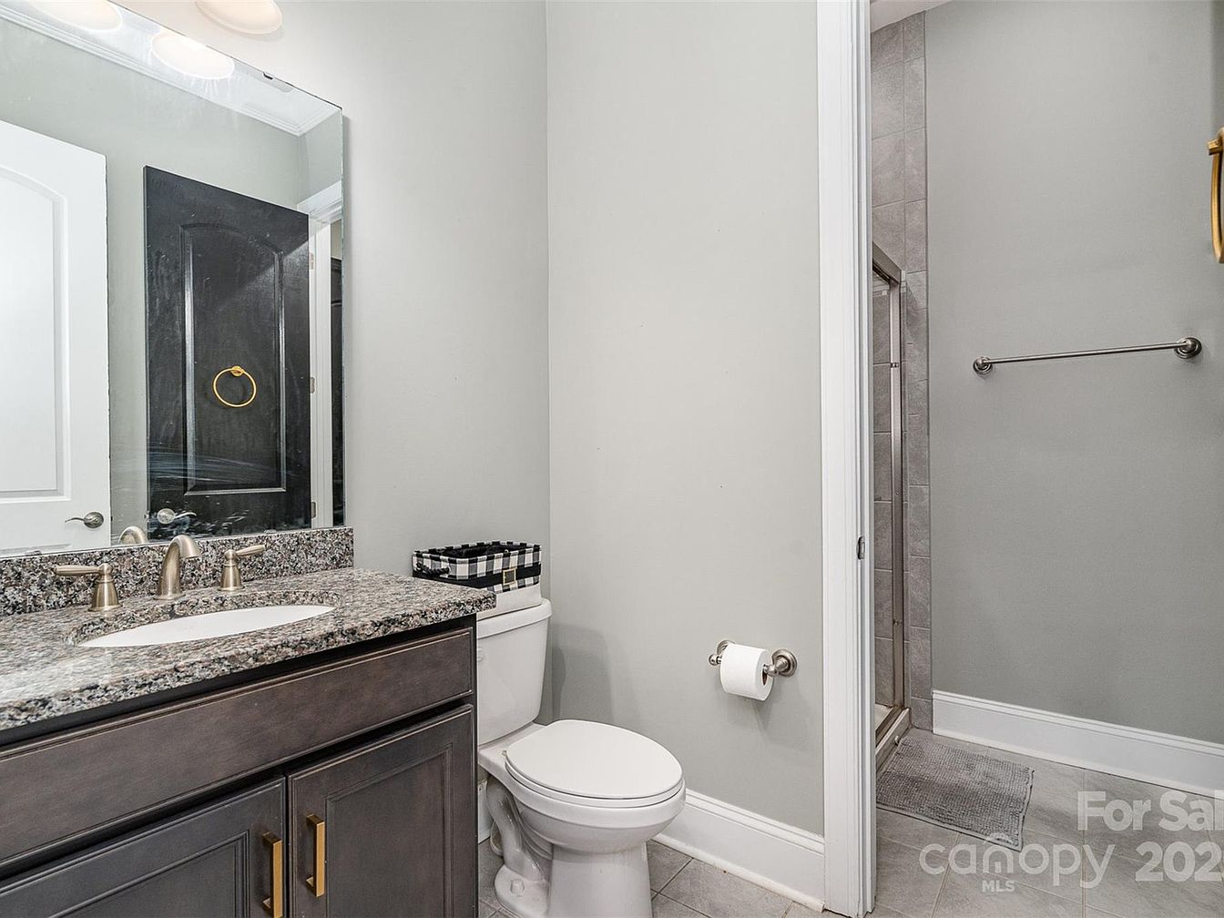 This bathroom features a modern and clean aesthetic with a neutral, soothing color palette. The walls are painted in a soft grayish-green tone, complemented by light gray floor tiles. A dark wood vanity with elegant brass hardware supports a granite countertop, housing an undermount sink fitted with sleek brushed nickel faucets. Above the vanity, a large rectangular mirror amplifies the natural light from the ceiling fixture. The white toilet sits neatly between the vanity and a doorway leading to a tiled shower area, which includes a glass door and a simple silver towel bar on the adjacent wall. The overall design balances functionality and subtle sophistication.