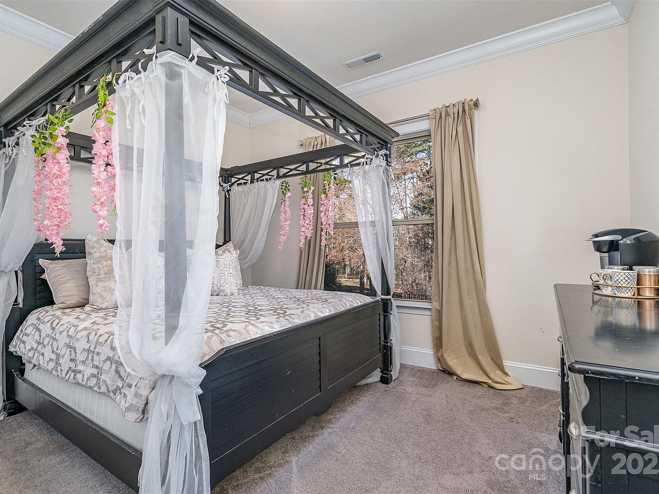 This bedroom features a striking dark wood canopy bed adorned with delicate white sheer curtains tied at the corners, creating an airy and romantic ambiance. Soft pink hanging floral accents add a gentle pop of color against the neutral tones. The walls are painted in a calming, light beige that complements the beige curtains framing the window, allowing natural light and a view of trees to brighten the space. A dark dresser anchors the room, topped with a small coffee station, blending functionality with comfort. The plush carpet floor enhances the cozy and inviting feel of the room.