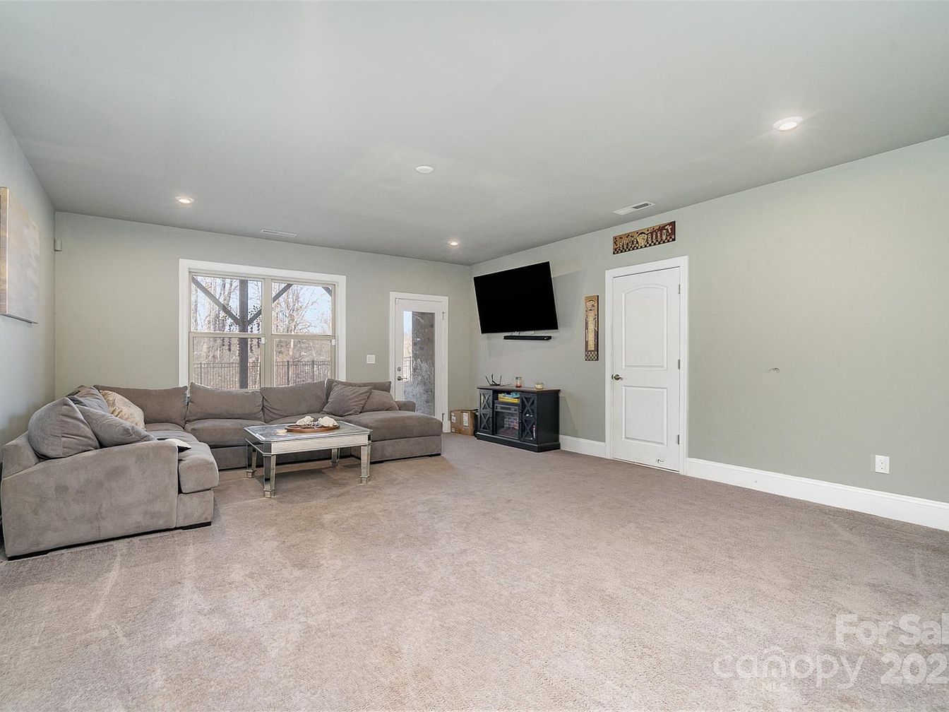 This spacious family room features a large, plush sectional sofa in a soft gray tone, positioned to face a wall-mounted flat-screen TV above a dark media console with storage. The walls are painted in a light sage green, creating a calm and inviting atmosphere. Recessed ceiling lights provide even illumination, and large windows along with a glass door enhance natural light and offer views of the outdoors. The neutral beige carpet adds warmth and comfort underfoot, while simple white trim and doors complete the clean, contemporary look of this cozy living space.