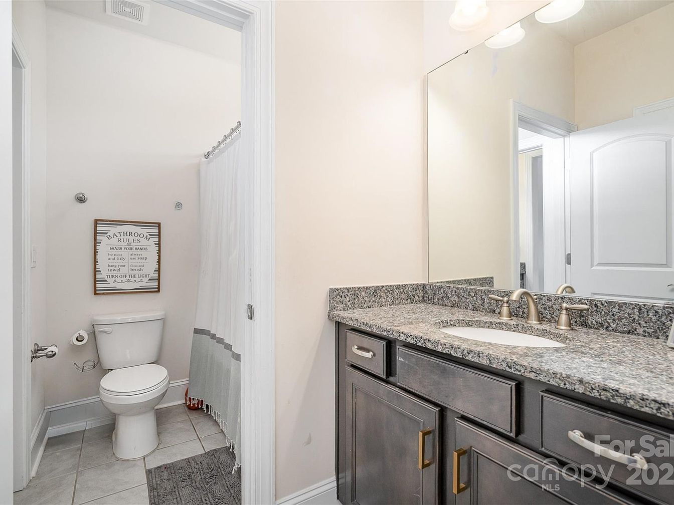 This bathroom features a well-organized layout with a granite countertop vanity positioned on the right side, complete with sleek brushed nickel faucets and dark wood cabinetry offering ample storage. The neutral-toned walls and floor tile create a serene atmosphere, enhanced by bright, natural lighting reflecting from a large mirror above the sink. To the left, the toilet sits in a separated nook partially enclosed by a white shower curtain with subtle gray detailing, providing privacy and delineation within the space. The decor is minimal, highlighted by a framed sign with bathroom rules, adding a charming finishing touch.
