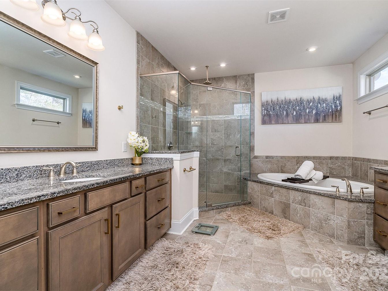 This spacious master bathroom offers a serene and functional design with a neutral palette dominated by grey and beige tones. A long vanity with textured granite countertop and warm wood cabinetry features brushed metal handles and under-mount sink fixtures. The walk-in shower is enclosed in frameless glass with stone tile walls incorporating a decorative horizontal accent strip. Adjacent is a deep soaking tub surrounded by matching tile, perfect for relaxation. Fluffy, beige rugs soften the tiled floor, while natural light streams in from two small, modern windows. Artwork featuring forest imagery adds a calming touch to the space.