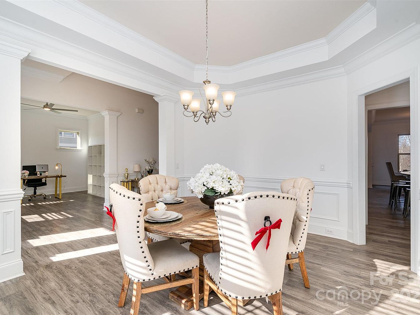 This formal dining area features a round wooden table surrounded by four beige upholstered chairs detailed with dark nailhead trim and subtle red bows on the back handles, adding a festive touch. The room boasts bright white walls with elegant wainscoting and crown molding, complementing the warm tone of the wood-look flooring. Above the table hangs a classic brushed nickel chandelier with frosted glass shades, providing soft ambient lighting. Openings lead to adjoining rooms, enhancing spaciousness and flow, while natural light filters through window blinds, casting gentle shadows across the floor and furniture for a welcoming atmosphere.