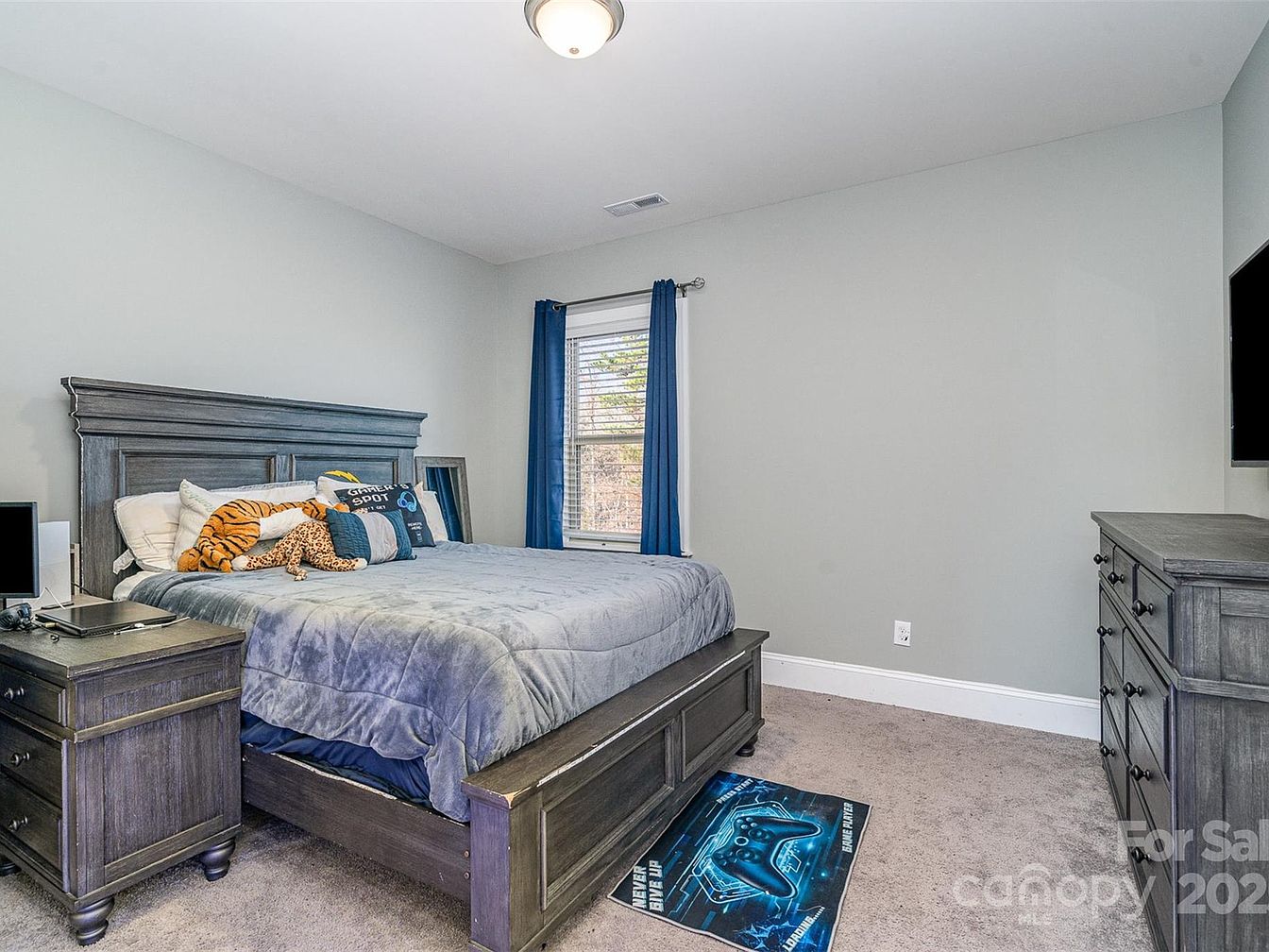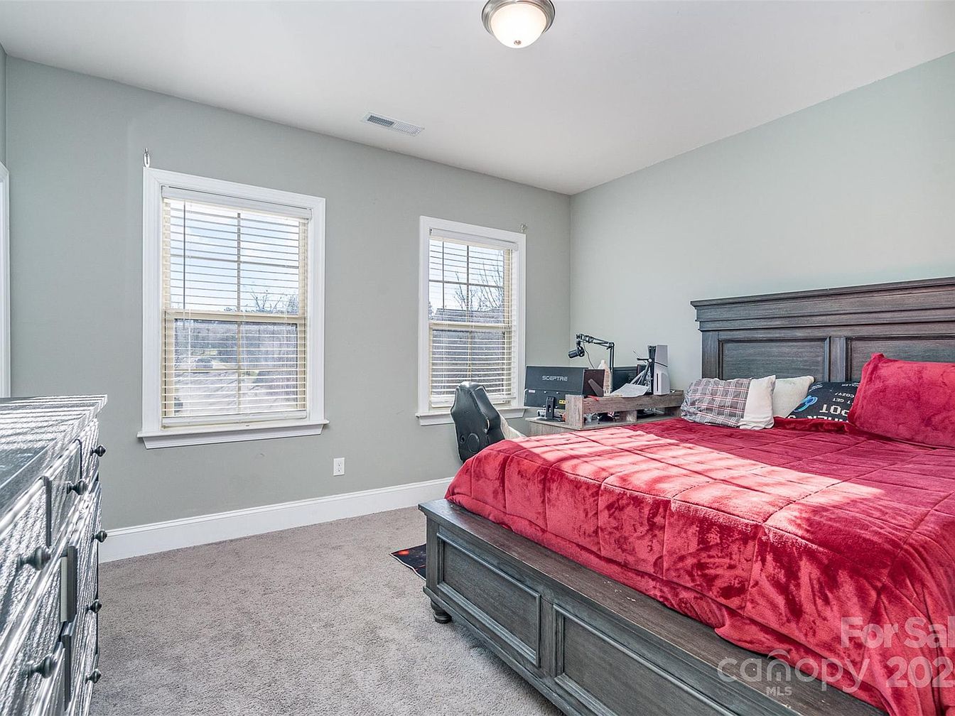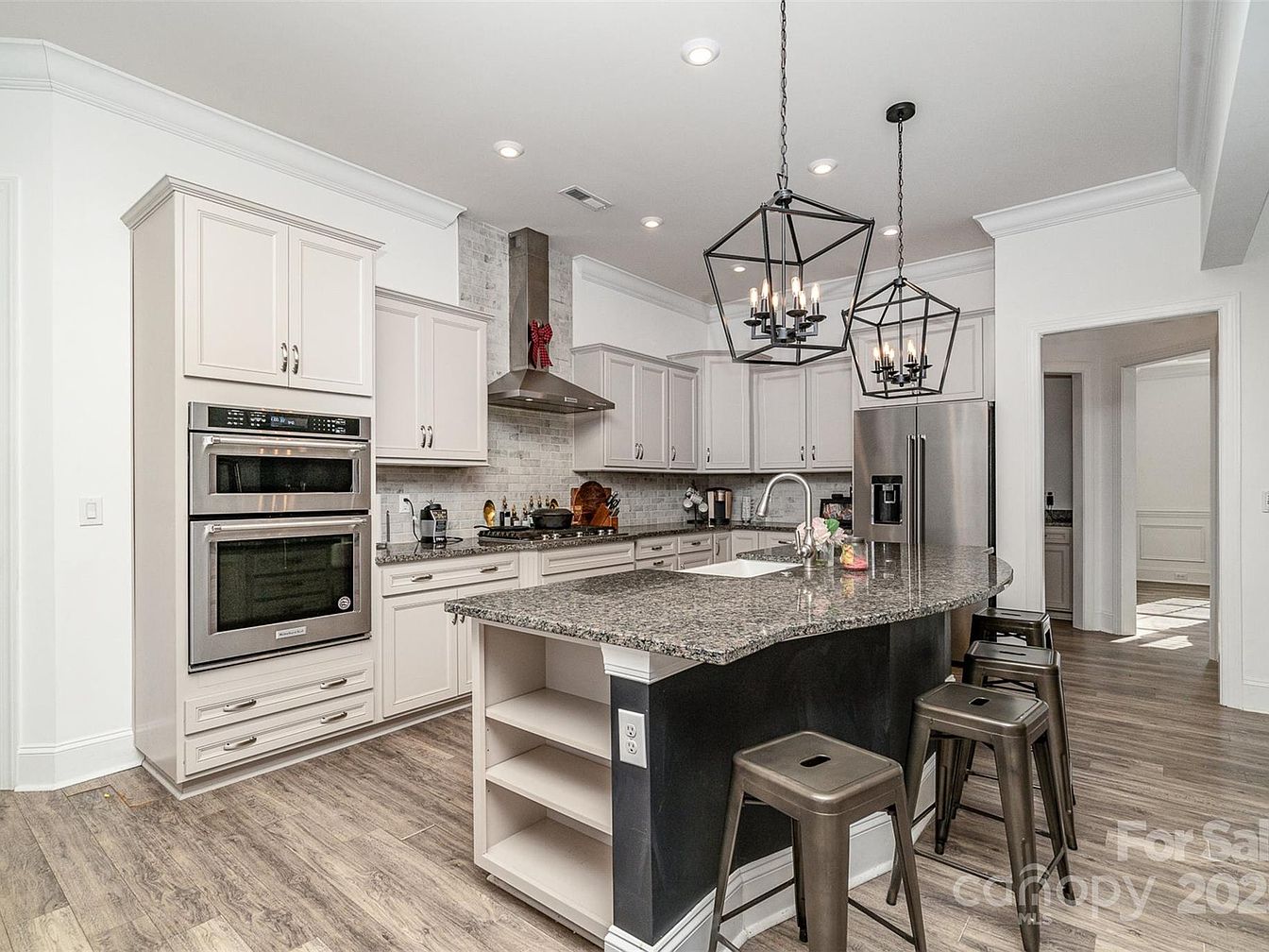 This elegant home is situated in the highly desirable Olmsted neighborhood in Huntersville, North Carolina. Built in 2021, this property features a classic yet modern architectural style characterized by its brick facade combined with structured gable roofs and a charming rocking chair covered front porch. The residence is designed to accommodate contemporary family living with a spacious Worthington floor plan, including 6 bright bedrooms and 5 full bathrooms. A standout feature is the gourmet island kitchen, tailored for culinary enthusiasts and perfect for entertaining guests. The main level includes a convenient bedroom with an en suite bathroom, a dedicated home office, a formal dining room, and a welcoming flex space near the front door. Additional living space is available in the walk-out basement, which includes an entertainment area and a gym. The home also offers a 3-car garage equipped with a drop zone, an upstairs full laundry room, and a luxurious primary bedroom suite that boasts an extended closet which can be converted into additional living space. The lot provides ample room for a potential pool, enhancing outdoor living possibilities. Listed at $1,250,000, this beautiful home in a prime location also includes a $9,000 lender incentive, making it a fantastic opportunity for buyers seeking comfort, style, and functionality in a sought-after community.