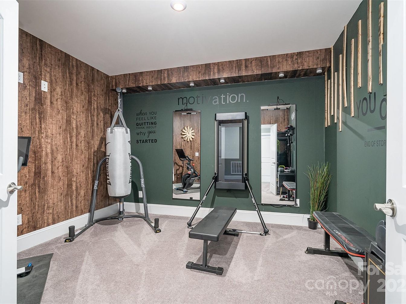 This home gym offers a functional and motivating workout space, combining earthy and modern elements. The walls feature a contrasting design with rich wood paneling on one side and deep green paint on the other, accented by inspirational motivational quotes. Three tall mirrors are mounted on the green wall, which visually expands the room and enhances lighting. The ceiling alcove above the mirrors includes recessed lights for focused illumination. The equipment includes a punching bag with a sturdy frame, a weight bench, and a rowing machine. A small potted plant adds a touch of greenery, while the beige carpet floor softens the space, making it inviting and comfortable for workouts.