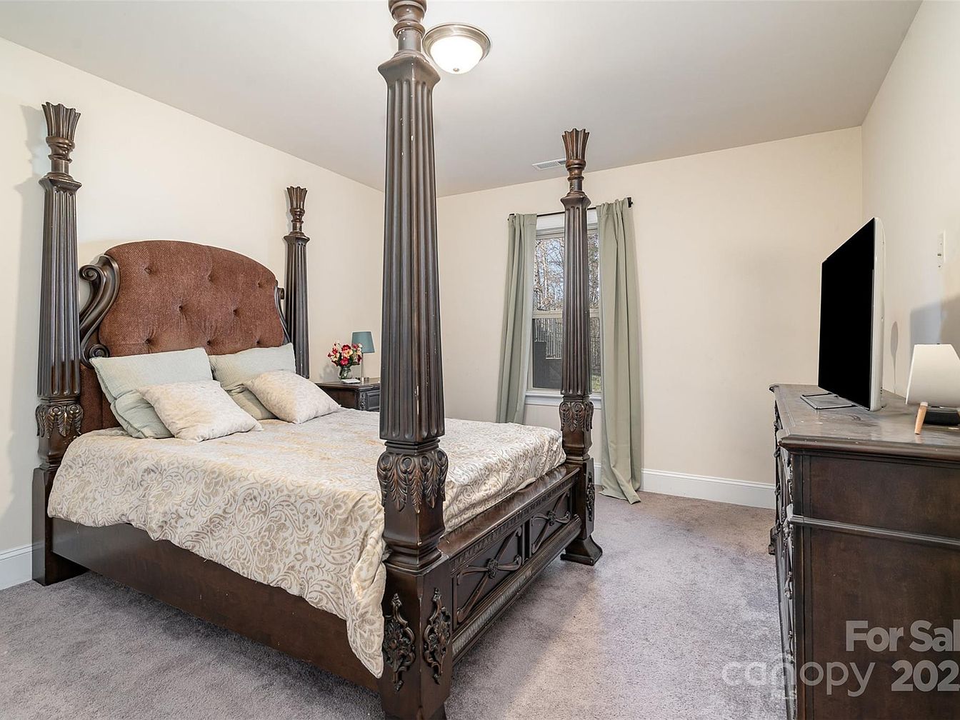 This master bedroom features a stately four-poster bed with intricately carved dark wood posts and a tufted chocolate-brown headboard that adds texture and warmth. The bedding in neutral tones with subtle patterns complements the calming color scheme of pale walls and soft grey carpeting. Beside the bed, a small nightstand holds a blue table lamp and a floral arrangement, adding a touch of color. A window dressed with simple greyish-green curtains lets in natural light. Opposite the bed, a matching dark wood dresser supports a large flat-screen TV, blending traditional craftsmanship with modern convenience.