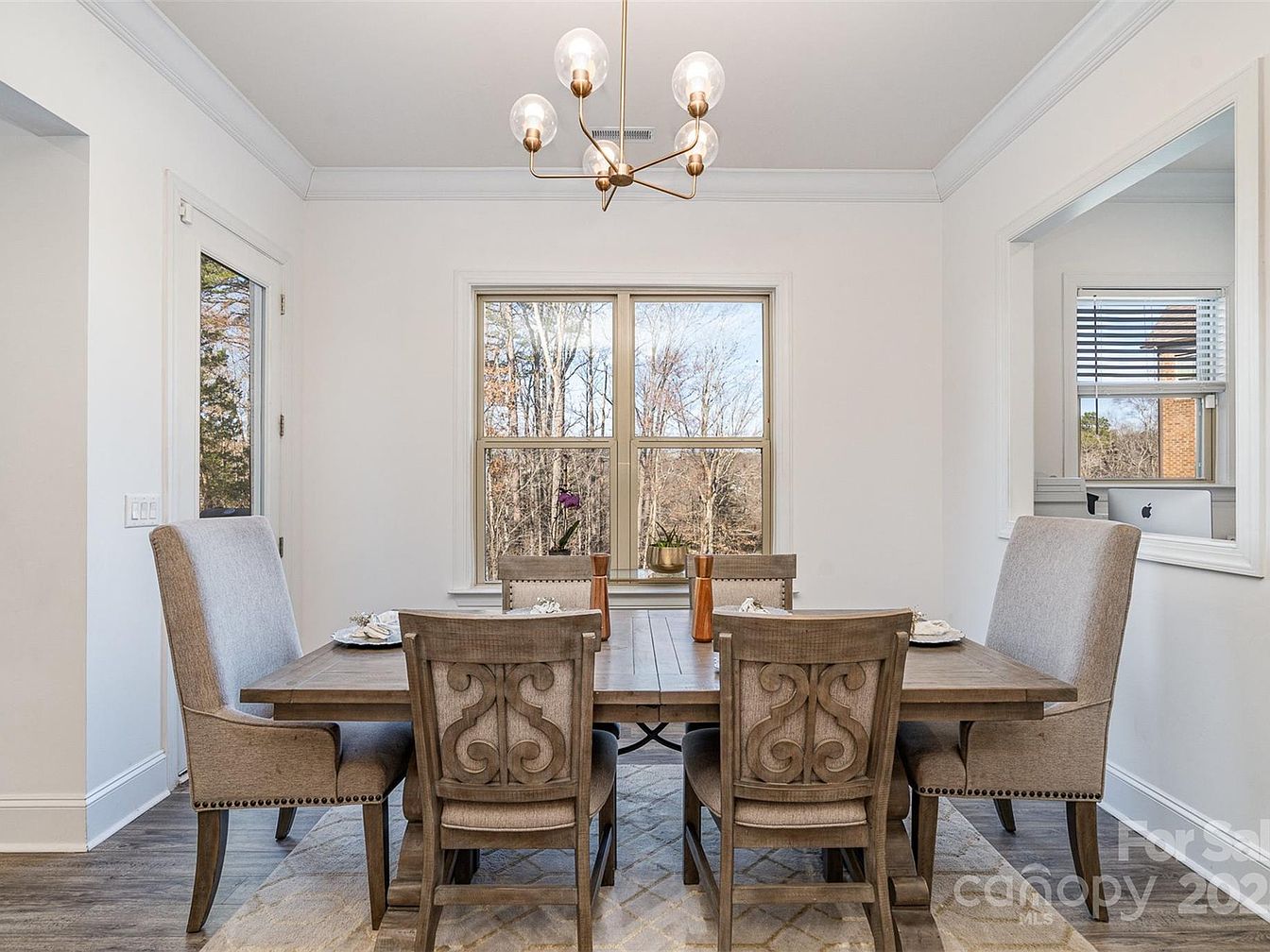 The dining area features a medium-toned wooden table paired with a mix of upholstered high-back chairs and ornately-carved wooden chairs, creating a blend of comfort and elegance. Soft beige walls and white crown molding frame the space, enhancing its clean and bright ambiance. Large windows bring in natural light and offer a view of the wooded scenery outside, adding a natural element to the room’s neutral palette. A modern chandelier with exposed bulbs hangs centrally above the table, providing a stylish focal point that complements the contemporary yet warm design theme. The light wood flooring and subtle patterned rug anchor the setting beautifully.